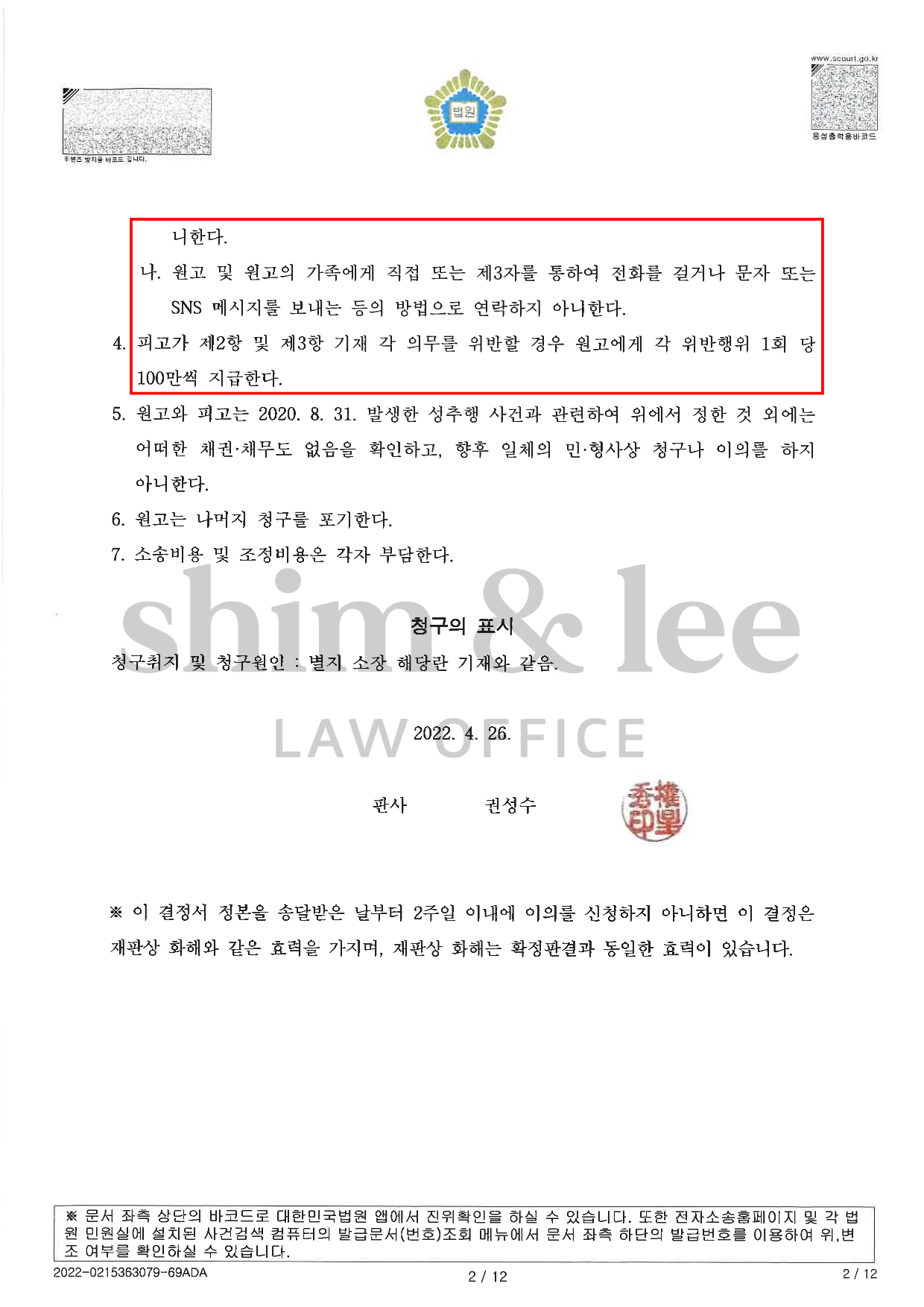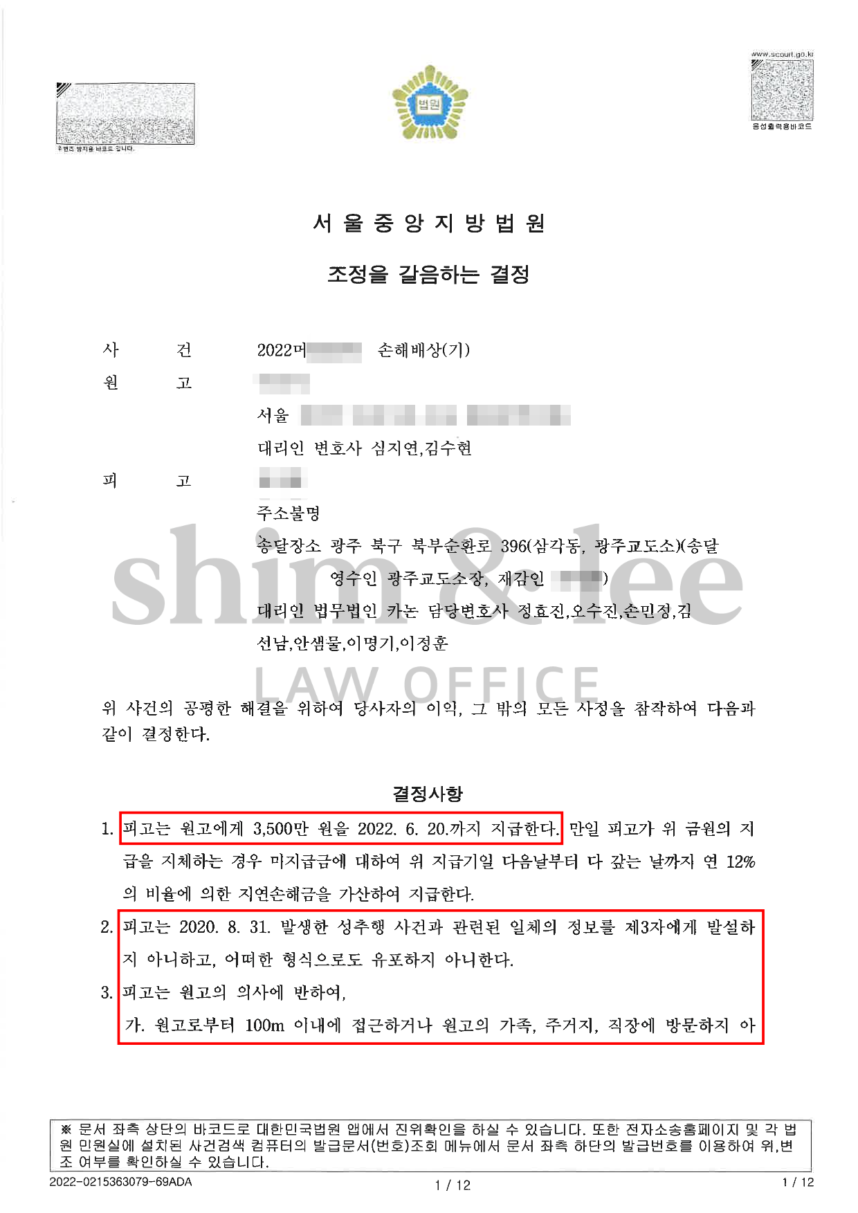 또한 사건 내용 유포 금지 및 비밀 유지, 피해자는 물론 가족에 대한 접근 금지 및 연락 금지 등 추가적인 피해자 보호조치와 위반 시 손해배상책임까지 세부적인 조정 조항을 자세히 넣었습니다.