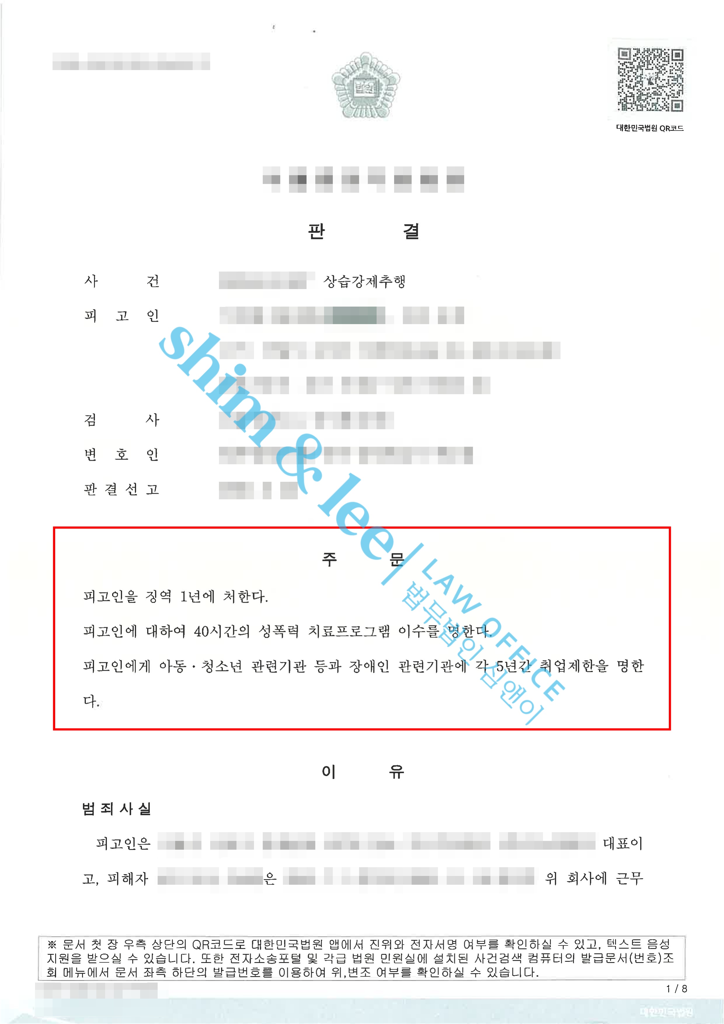 - 그 결과 재판부는 가해자에게 징역 1년(법정구속)과 함께 성폭력 치료 강의 40시간, 취업 제한 5년을 선고하였습니다.