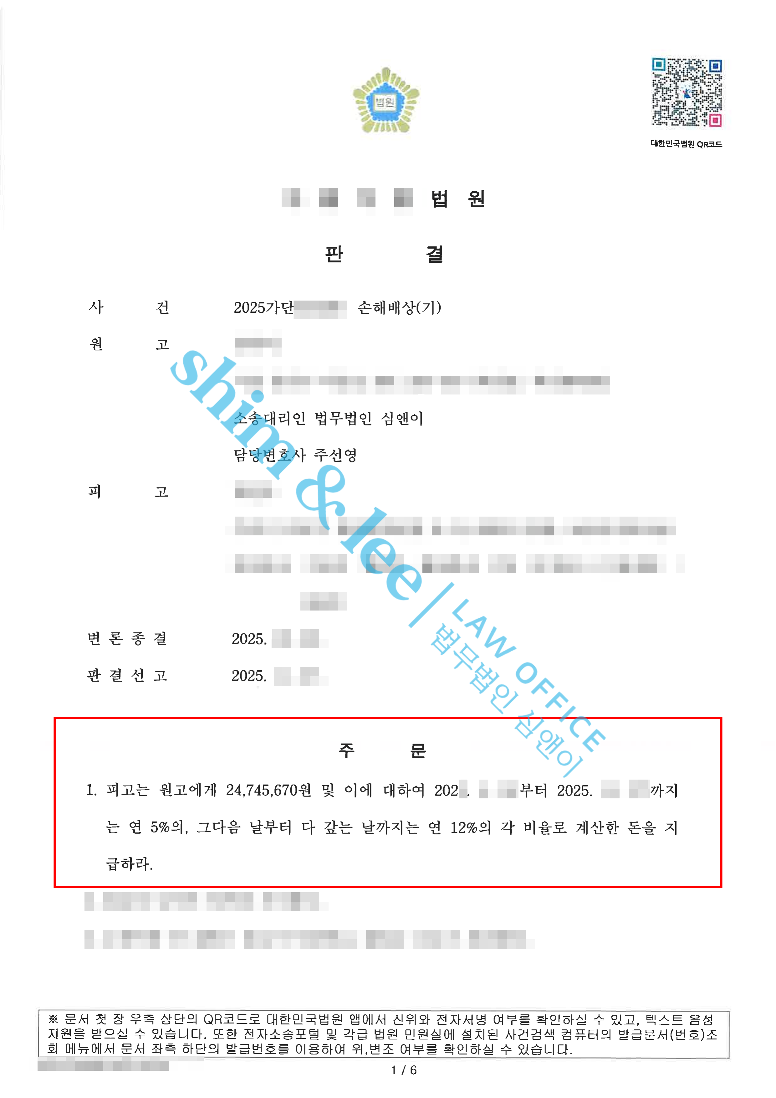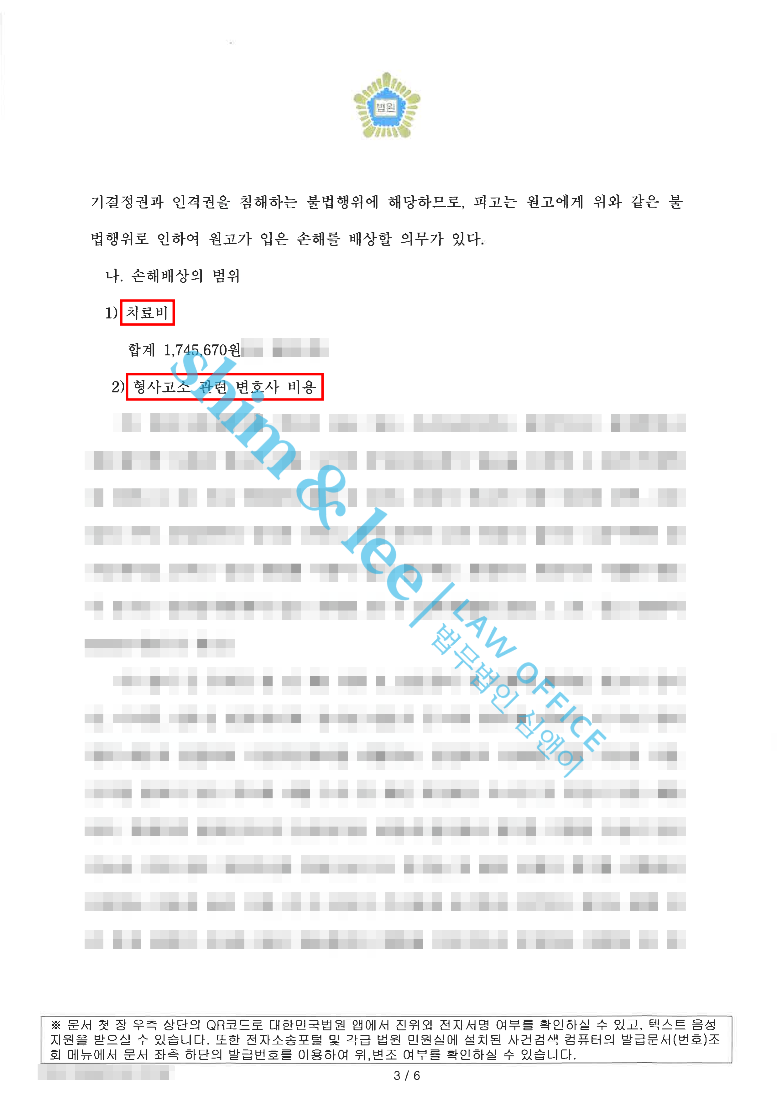 - 최종적으로 민사 재판부는 피고에게 손해배상 책임이 있음을 인정하고, 원고가 청구한 ① 실제로 지출한 적극적 손해인 치료비, ② 형사소송에서 사용한 변호사 선임 비용, ③ 피고의 불법행위로 인한 정신적 피해에 대한 위자료를 모두 받아들여 총 24,745,670원의 손해배상금을 인용했습니다.