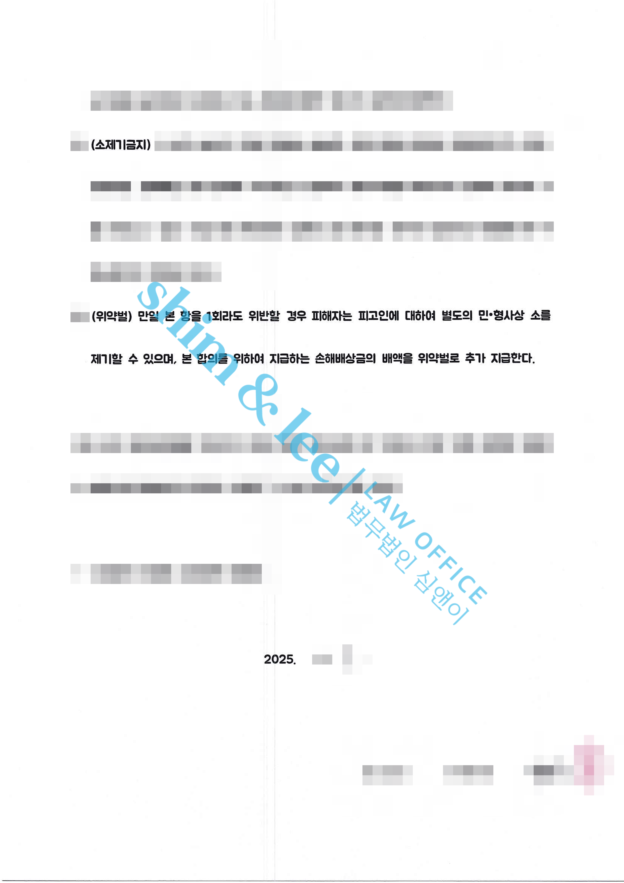 - 대표 변호사님은 피해자가 이 사건으로 더 이상 고통받는 일이 없도록 합의서에 비밀유지, 접근 및 보복금지, 통신제한, 소제기금지 조항을 추가하고, 이를 위반할 경우 가해자가 추가 금전을 지급하도록 하는 위약벌 조항까지 덧붙여 피해자에게 유리한 내용으로 합의서를 작성하였습니다.