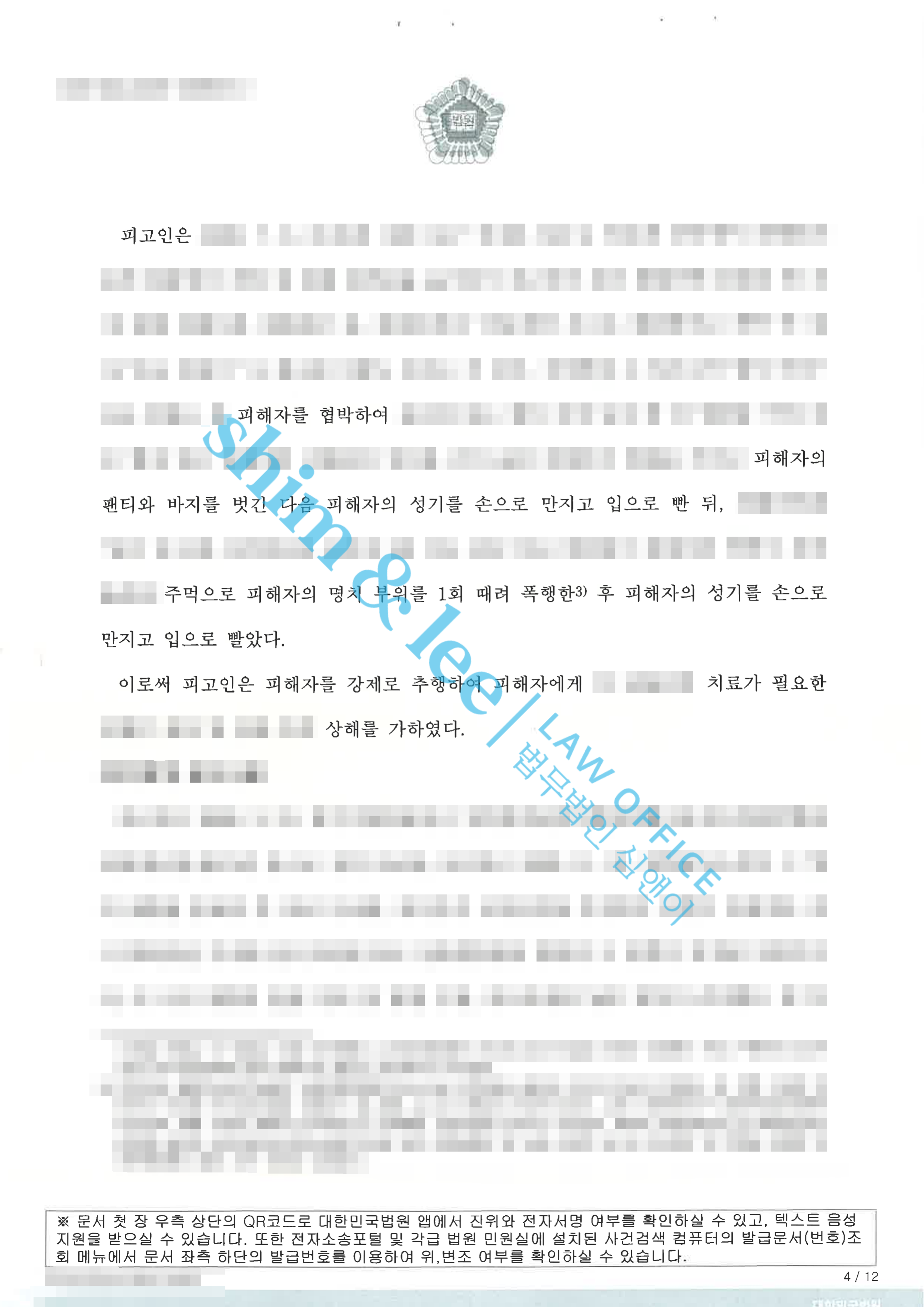 - 의뢰인은 가해자가 잠시 고개를 돌린 틈을 타 현장에서 벗어났고, 인근을 지나던 행인의 도움을 받아 곧바로 신고를 진행했습니다. 검찰은 가해자의 혐의가 충분하다고 보고 빠르게 기소했으며, 의뢰인은 재판 단계부터 전문적인 조력을 받아 가해자에게 최대한 엄중한 형이 선고될 수 있도록 대응하기 위해 심앤이 성범죄피해자전담센터를 찾아주셨습니다.