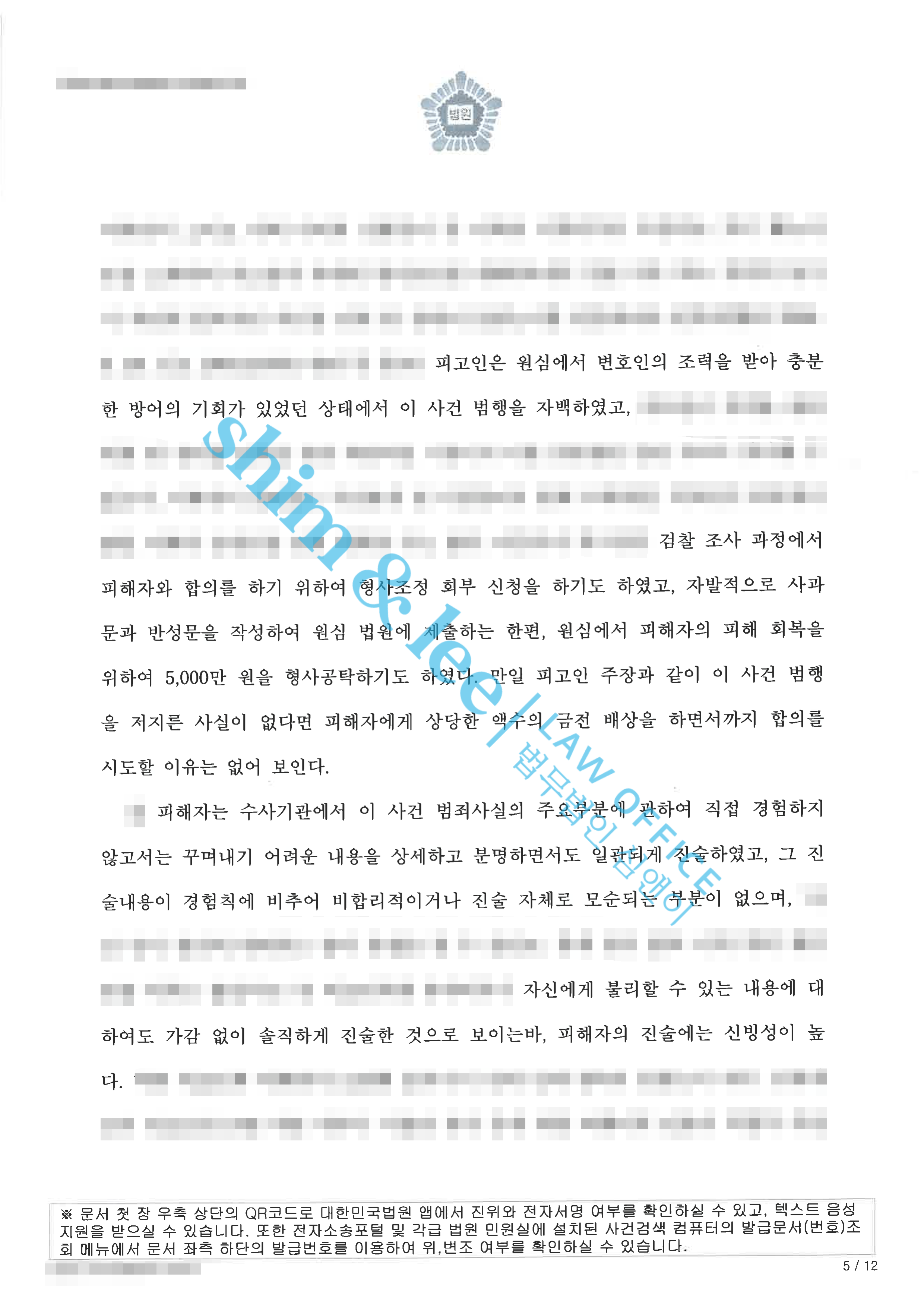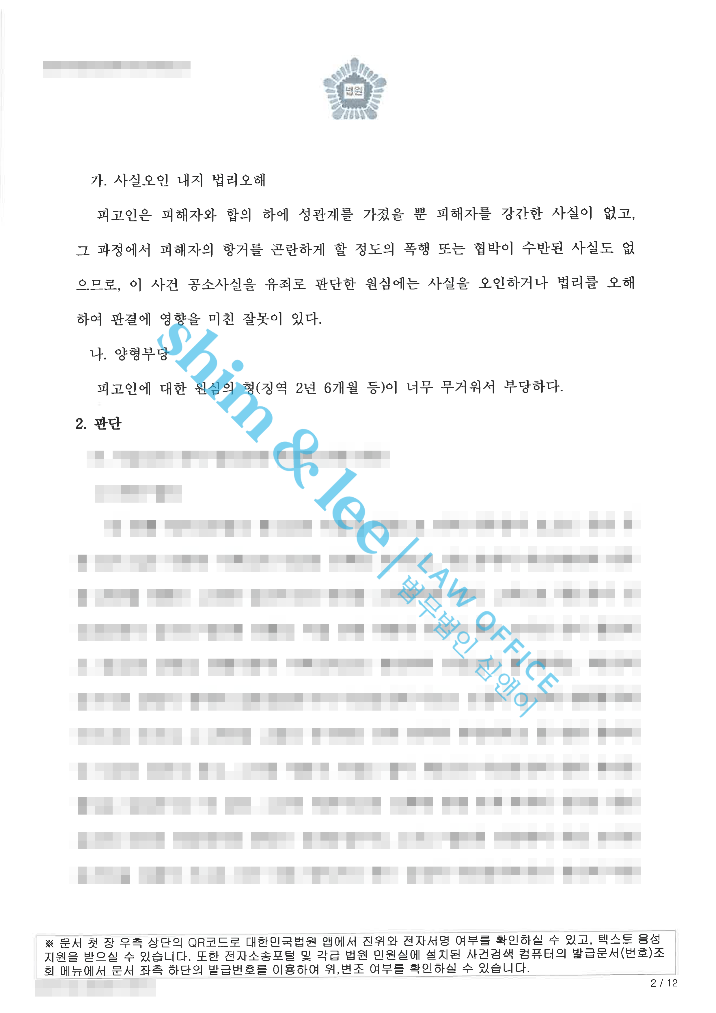 - 1심에서 범행을 인정하며 합의를 요청하던 피고인은 2심이 시작되자 태도를 바꾸어 “1심에서는 변호인의 권유로 범행을 인정했을 뿐”이라며 다시 서로 호감을 가지고 합의하에 이루어진 성관계였다고 주장하며 무죄를 다투기 시작했습니다. 심앤이는 피고인의 반복된 입장 변경과 모순된 주장들을 구체적으로 반박하는 의견서를 제출해, 항소심에서 판단이 뒤집히지 않도록 적극적으로 조력했습니다.