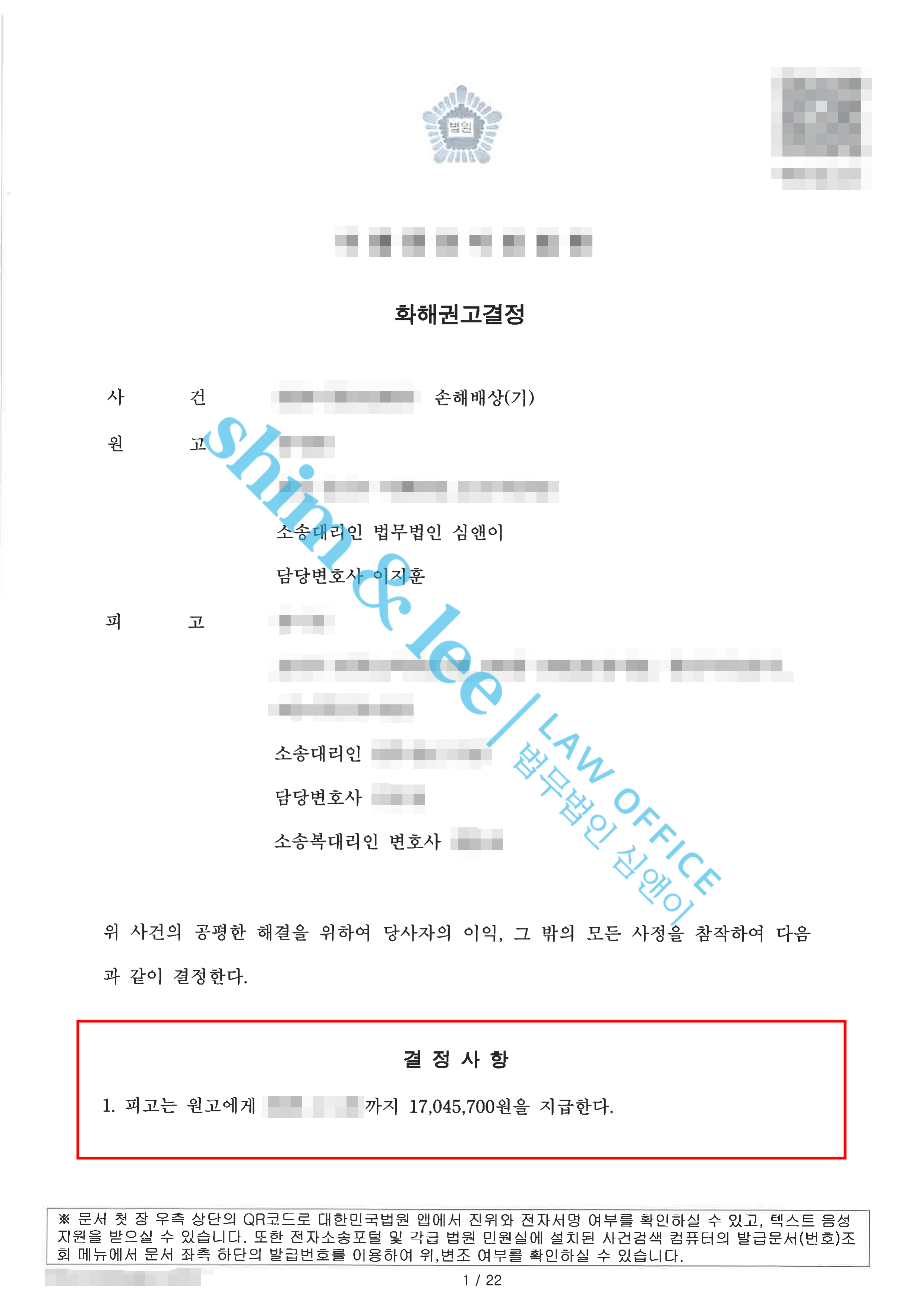 -재판부는 화해권고결정을 내렸고, 심앤이의 주장대로 의뢰인이 입은 정신적•물질적 피해가 인정되어 총 17,045,700원을 지급하라는 내용이 확정되었습니다.