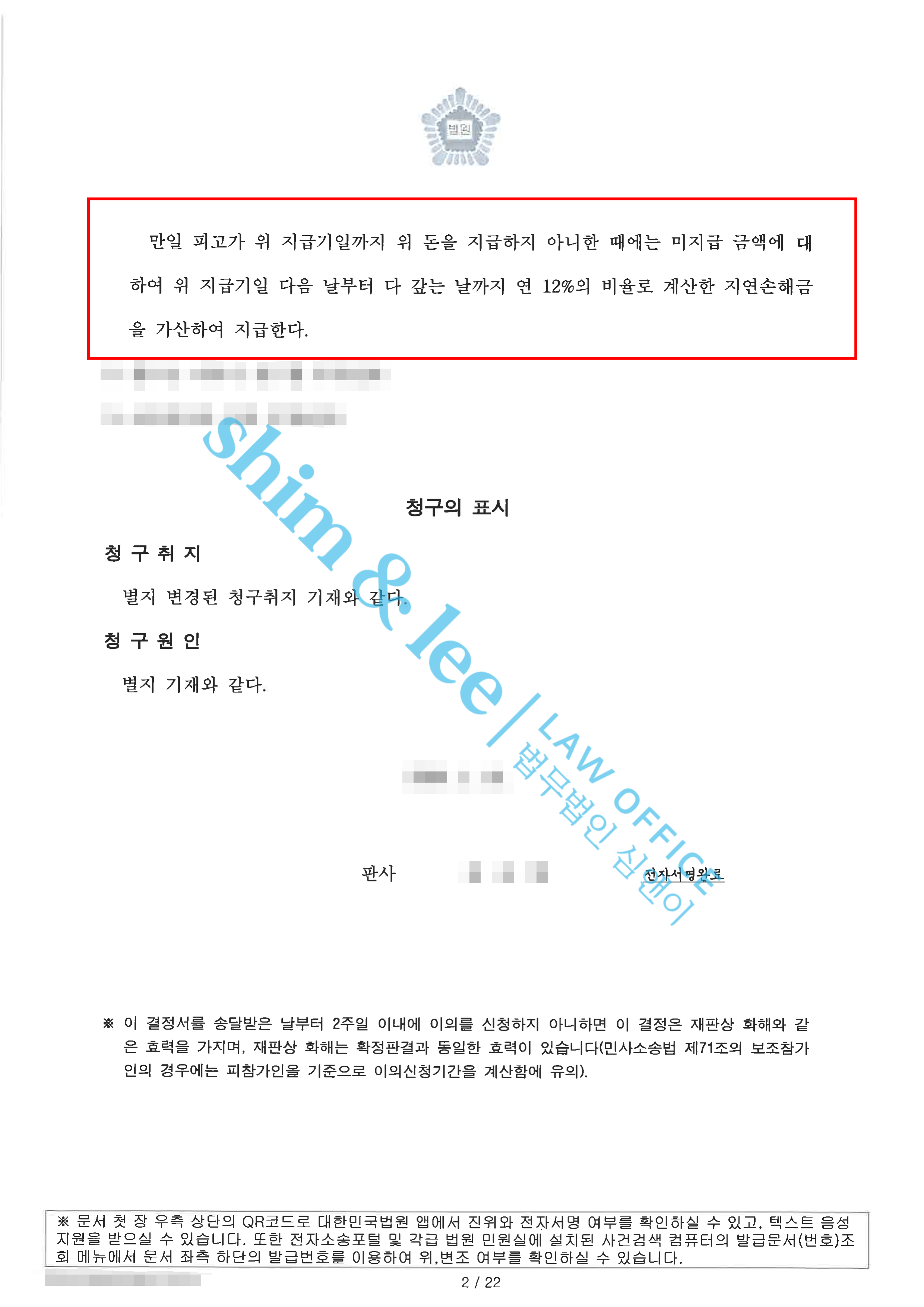 -피고가 이의를 제기하지 않으면서 화해권고결정은 그대로 확정되었고, 사건은 추가 분쟁 없이 마무리되었습니다. 의뢰인은 별도의 집행 절차 없이 정해진 지급 기한에 맞춰 손해배상금을 받을 수 있었다며 사건을 잘 이끌어준 심앤이에게 감사의 뜻을 전해주셨습니다.
