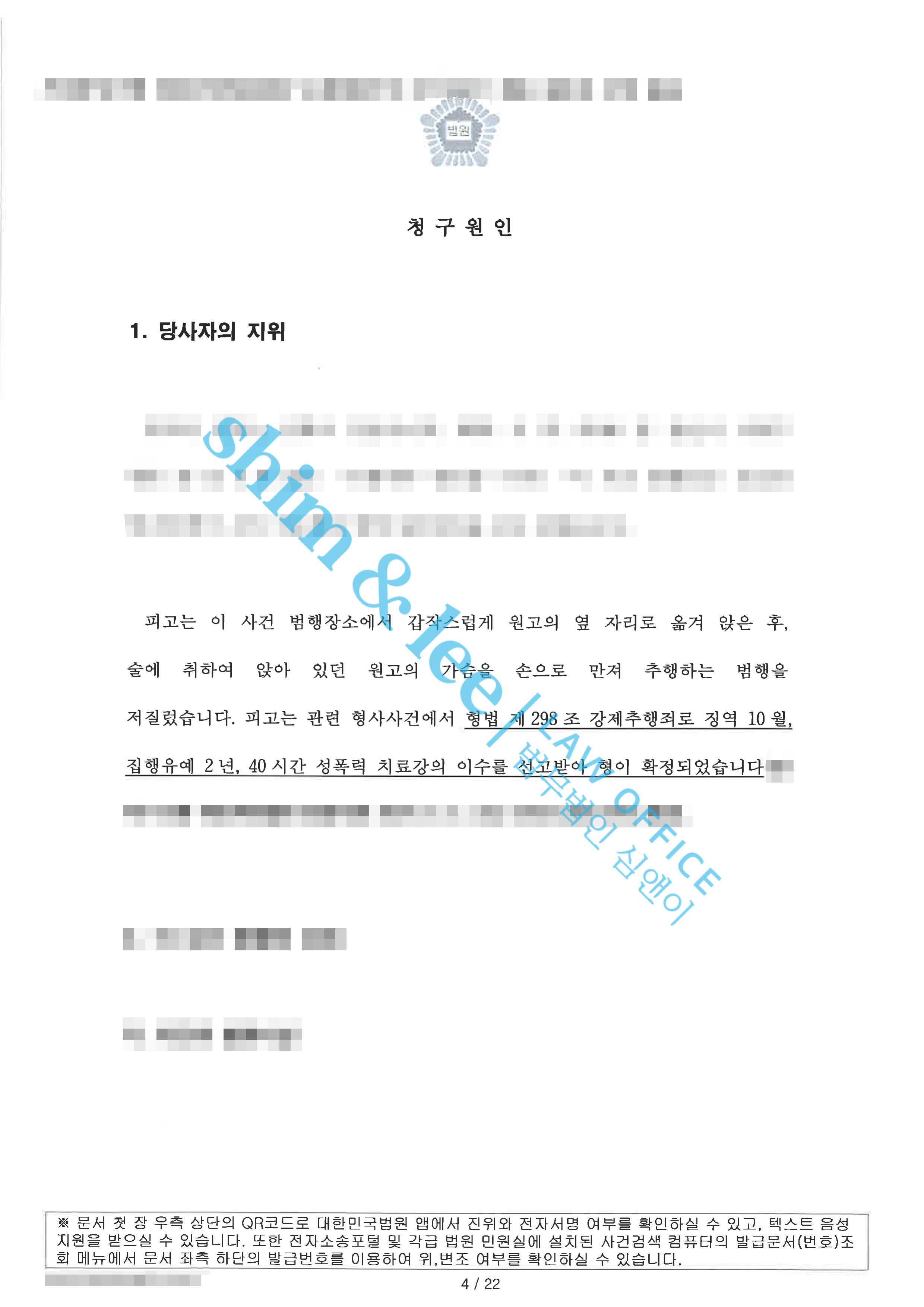 민사소송10년간 회사 대표에게 상습적으로 강제추행 피해, 소멸시효 깨고 위자료 손해배상 전부 인용받은 사건 2026.03.20손해배상금 60,114,160원 -