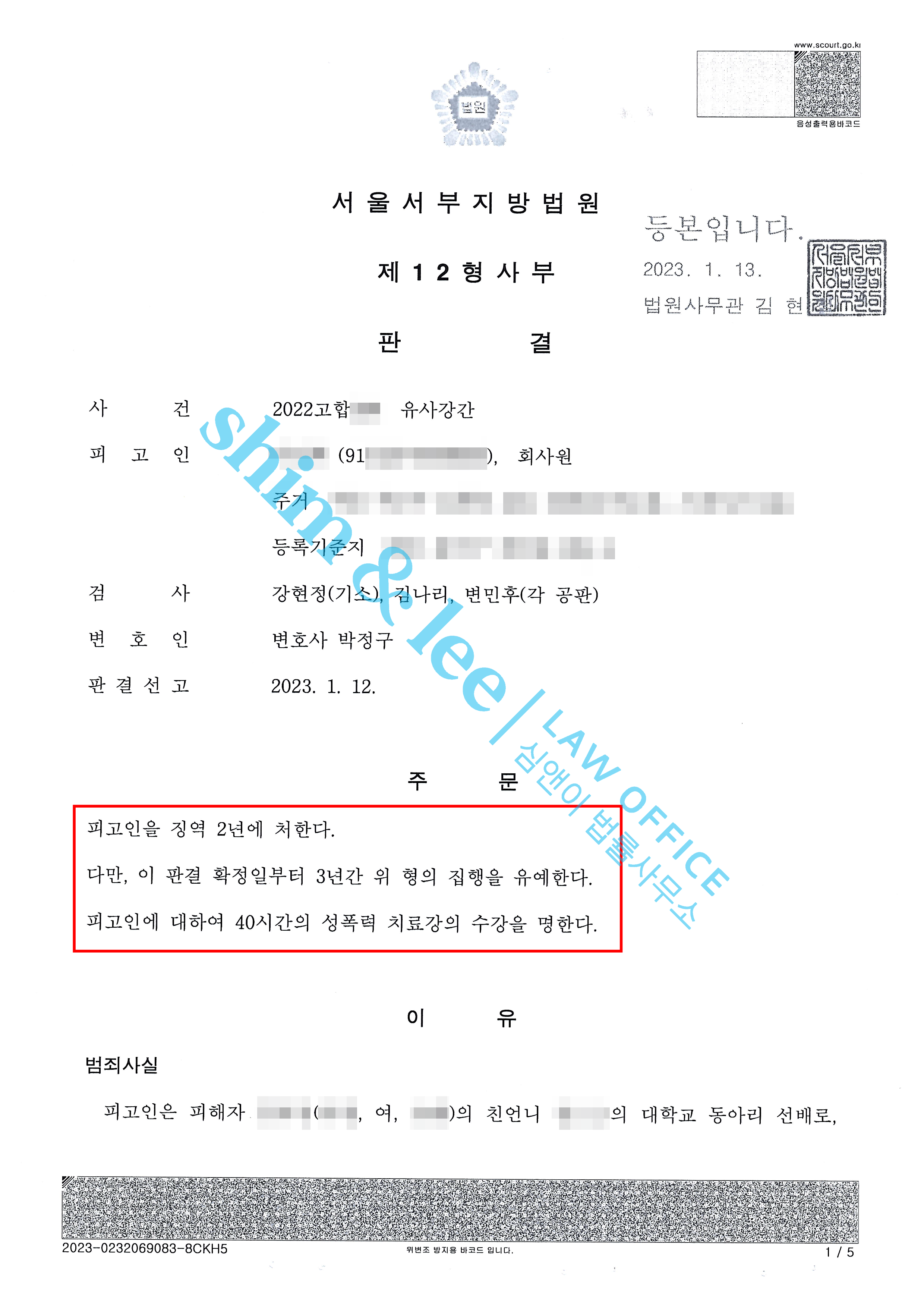 성폭력 치료강의 40시간 / 합의금 2,000만 원 -