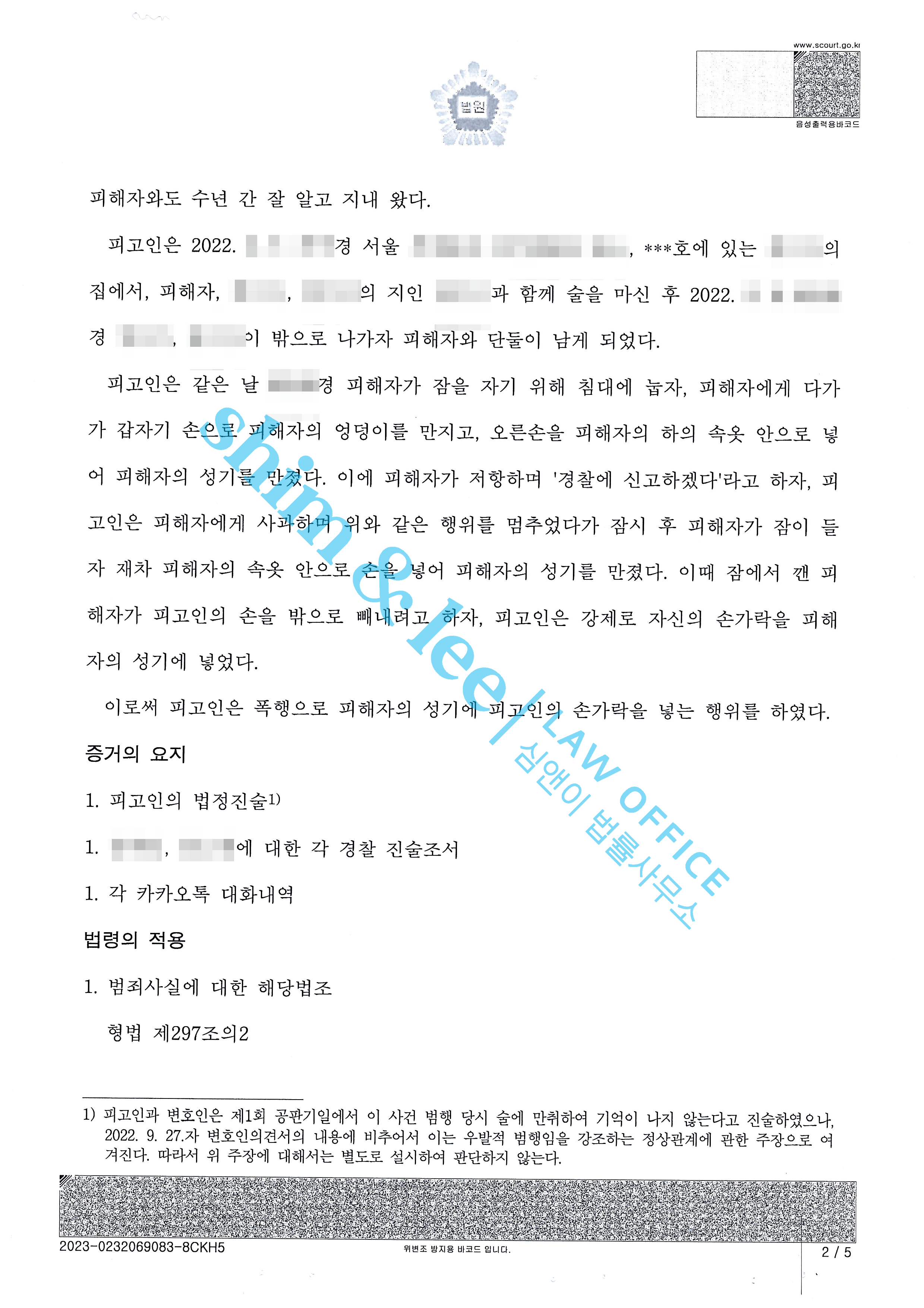 형사고소대학 동기인 가해자와 술을 먹던 중 기습적으로 추행당한 사례 2021.11.23합의금 2,000만 원 -