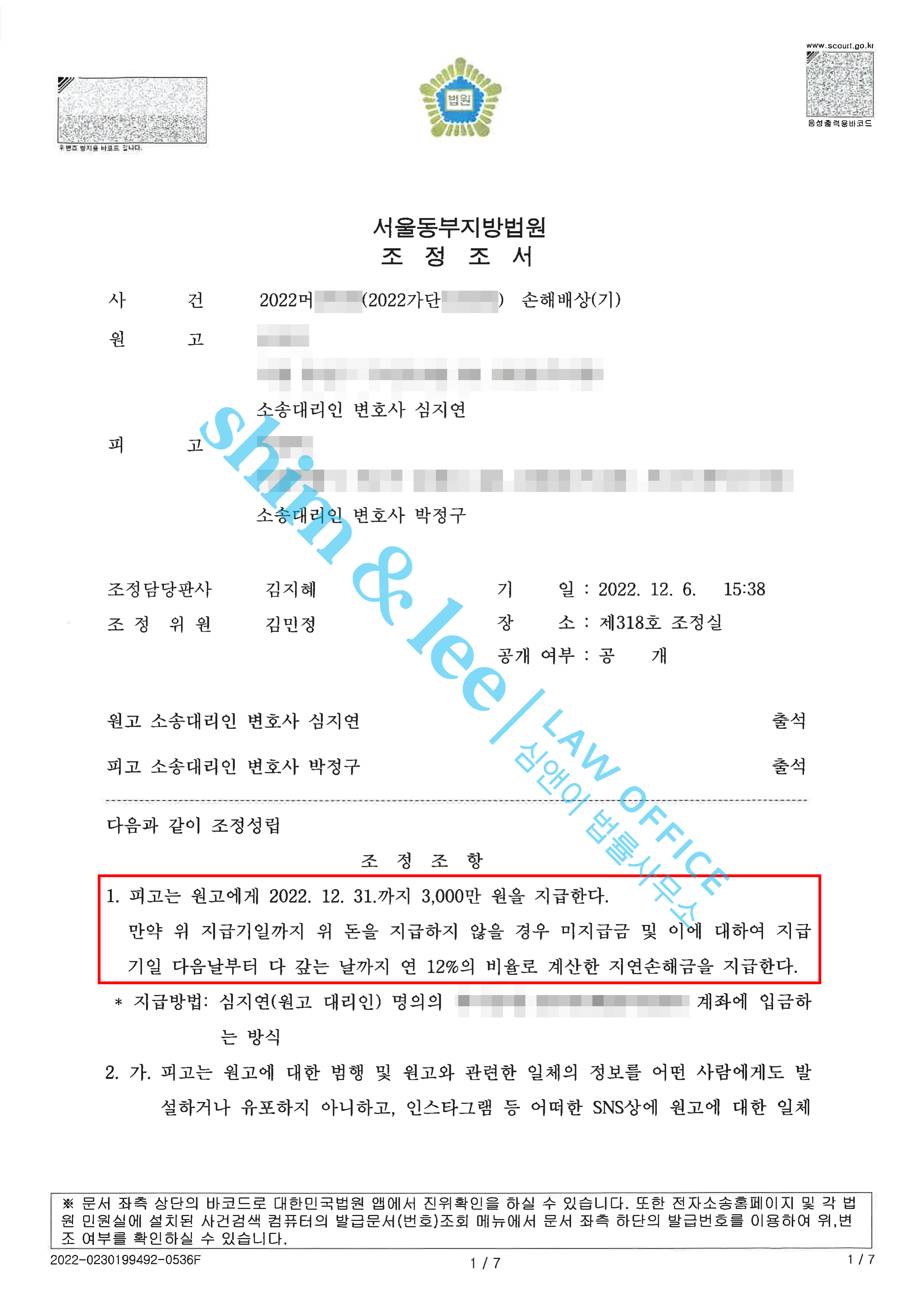 민사 조정에서의 치열한 공방 끝에 심앤이는 가해자에게 3,000만 원의 손해배상액을 받아낼 수 있었습니다. 피해자가 요청했던 발설 및 유포금지, 연락 및 접근 금지 등의 조항까지 전부 포함해 조정을 성립시켰습니다. -