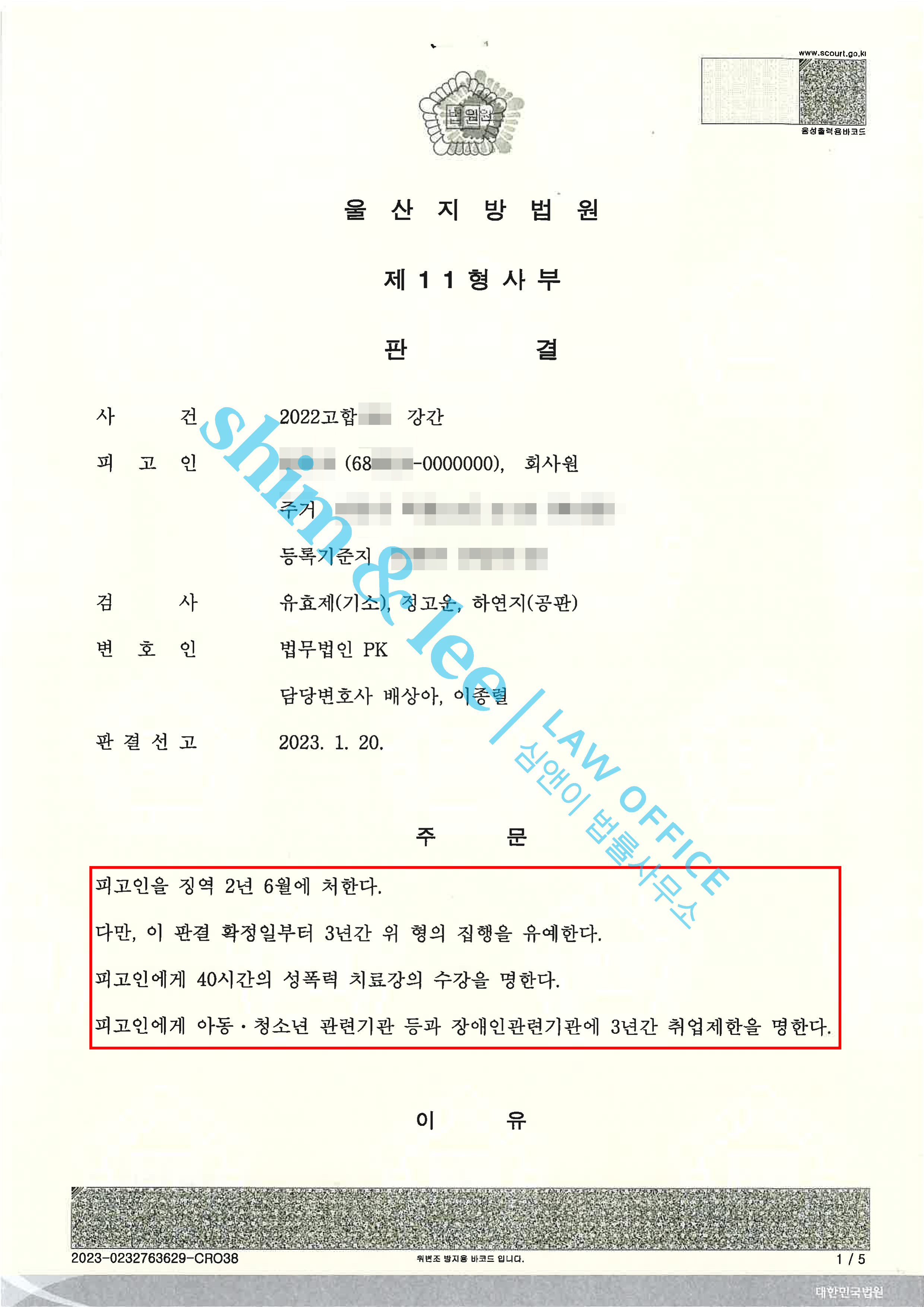 성폭력 치료강의 40시간 / 합의금 1,500만 원 -