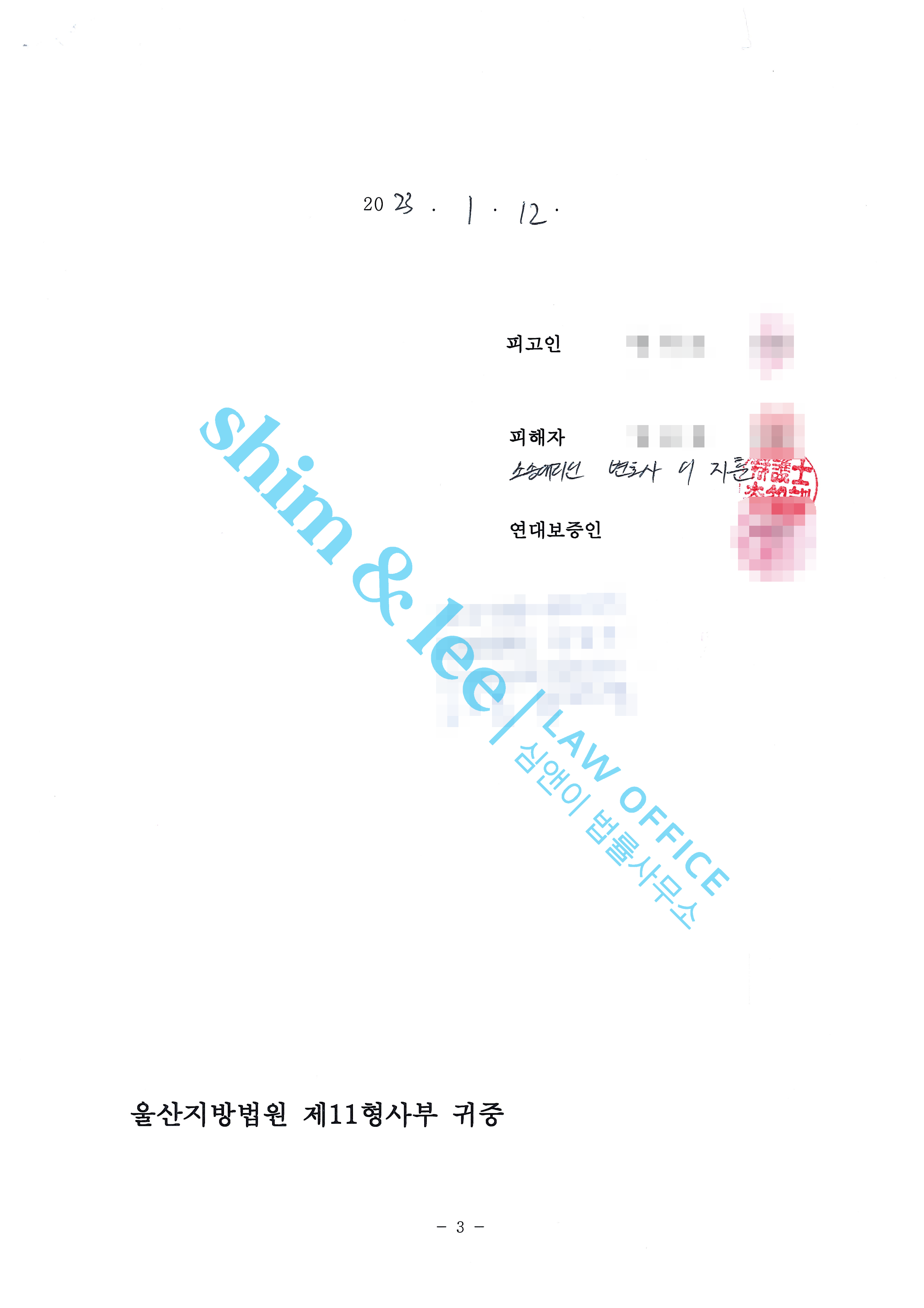 심앤이는 가해자의 변호사에게 연락해 가해자의 행동은 명백한 2차 가해이며, 절대로 용서할 수 없는 행위라고 경고했습니다. 실형에 대한 압박감이 커진 가해자는 피해자에게 사과편지를 보내며 선처를 구했고, 합의금을 어떻게든 마련해보겠다고 빌었습니다. -