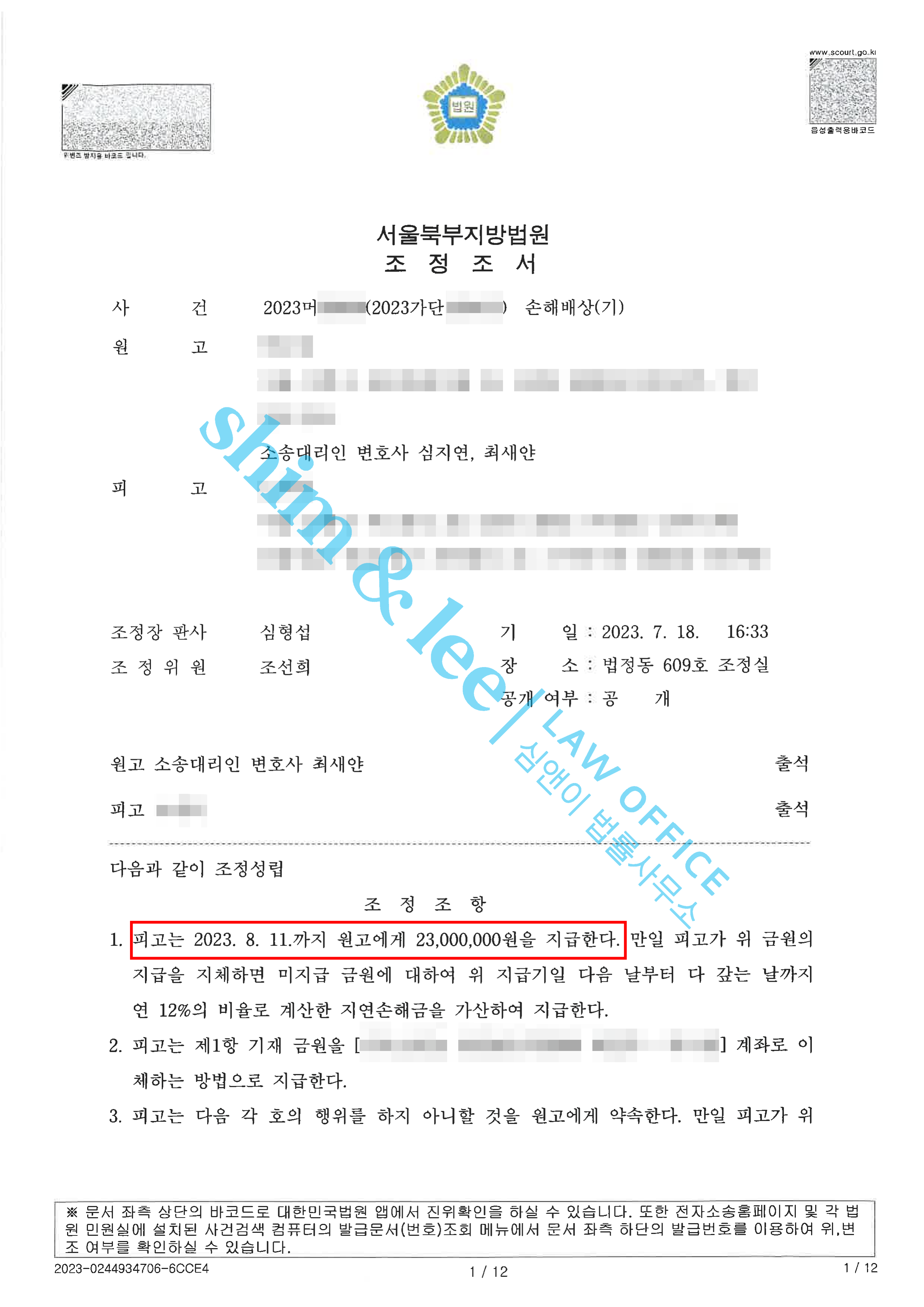 결과적으로 2,300만 원에 조정이 성사되었습니다. 자신의 피해사실조차 모르고 넘어갈 뻔했던 피해자는 정말 다행스럽게도 피해사실을 인지하고 가해자를 제대로 처벌한 다음, 민사소송으로 확실하게 피해보상까지 받을 수 있었던 아주 모범적인 사례입니다.