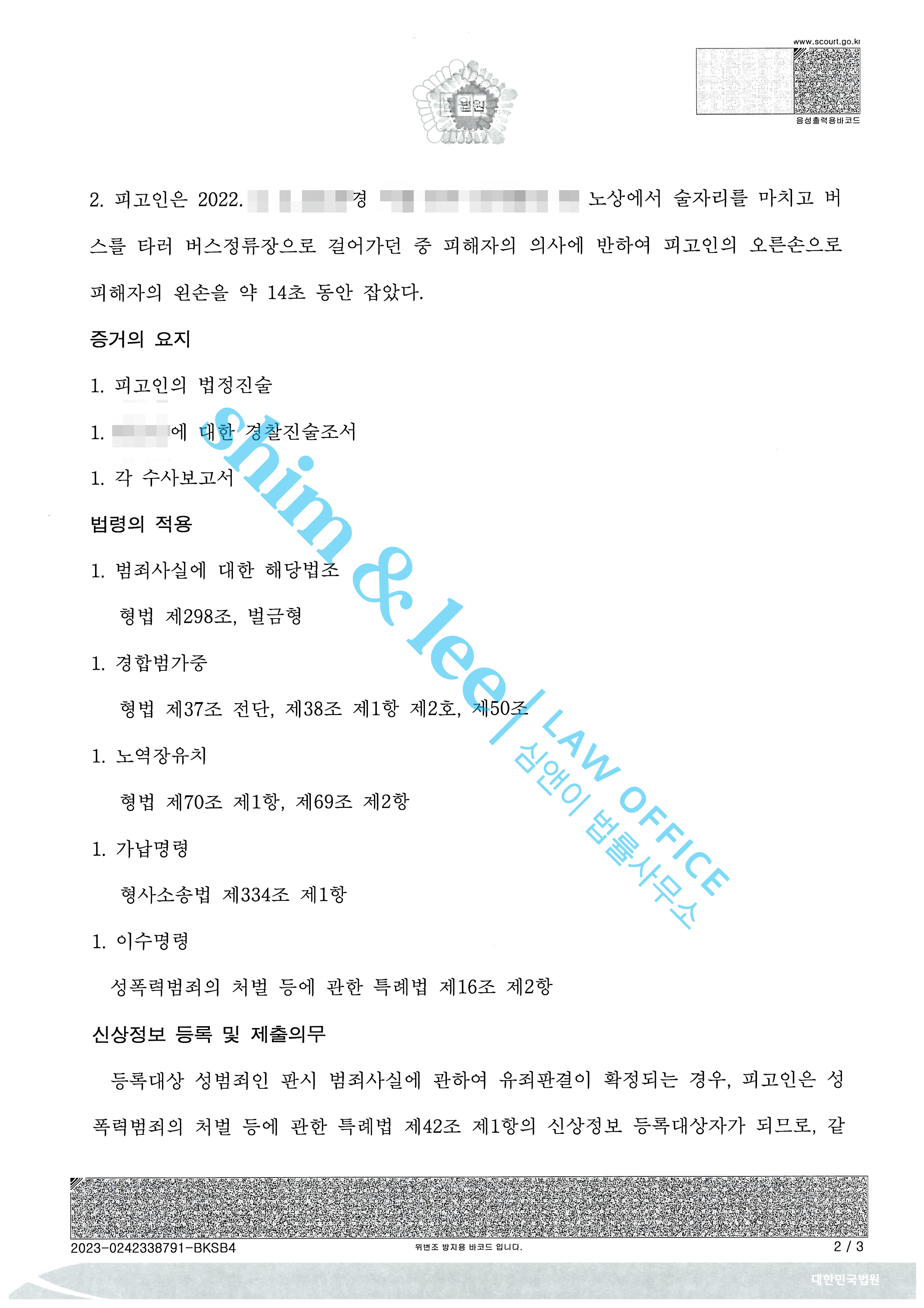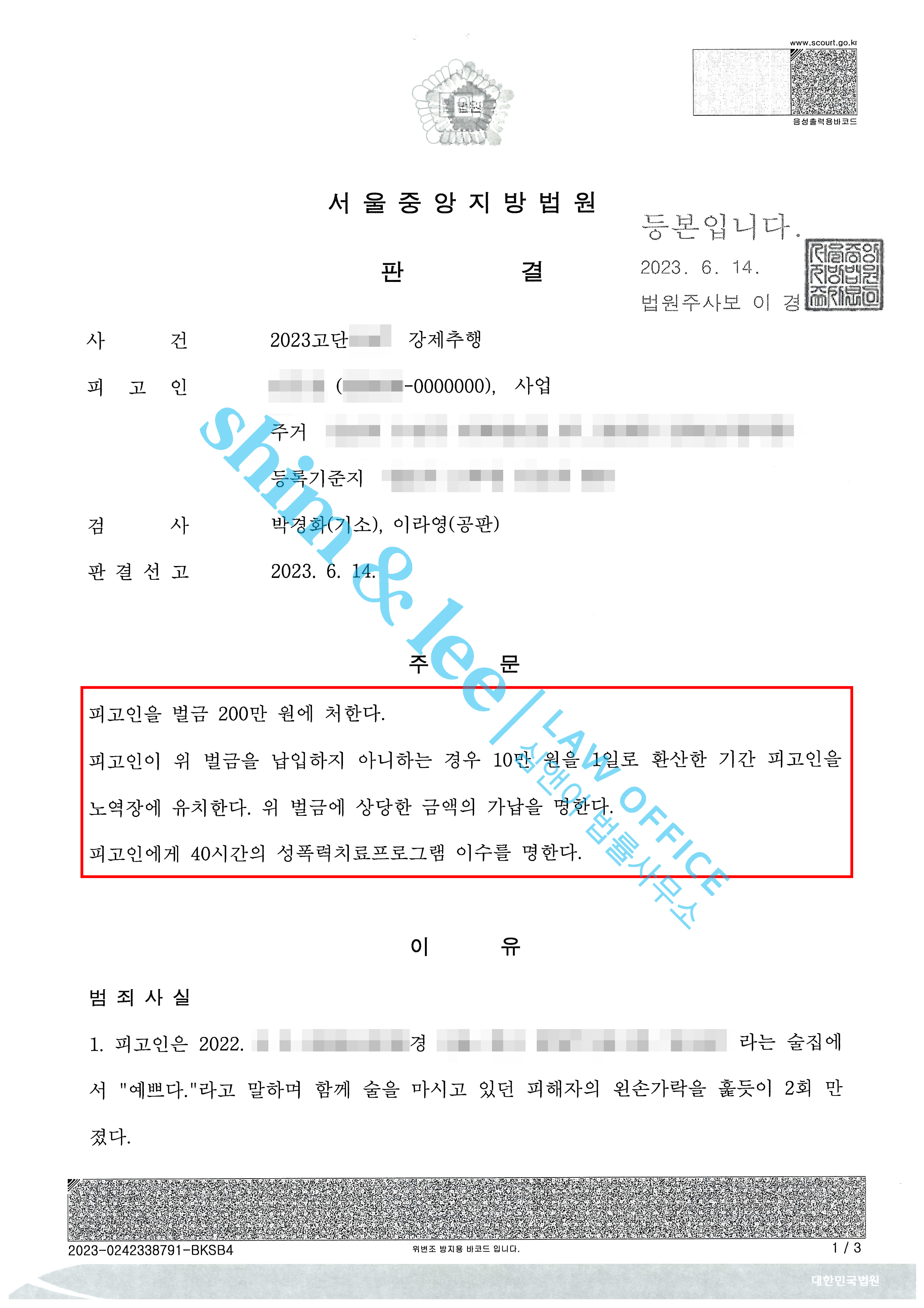 가해자는 합의를 했음에도 200만 원의 벌금형과 40시간의 성폭력 치료프로그램 이수명령을 받았습니다. 피해자는 충분한 피해보상을 받음과 동시에 가해자에게 성범죄 전과와 금전적 손해를 입혔다는 사실에 정말 만족해 하셨습니다.