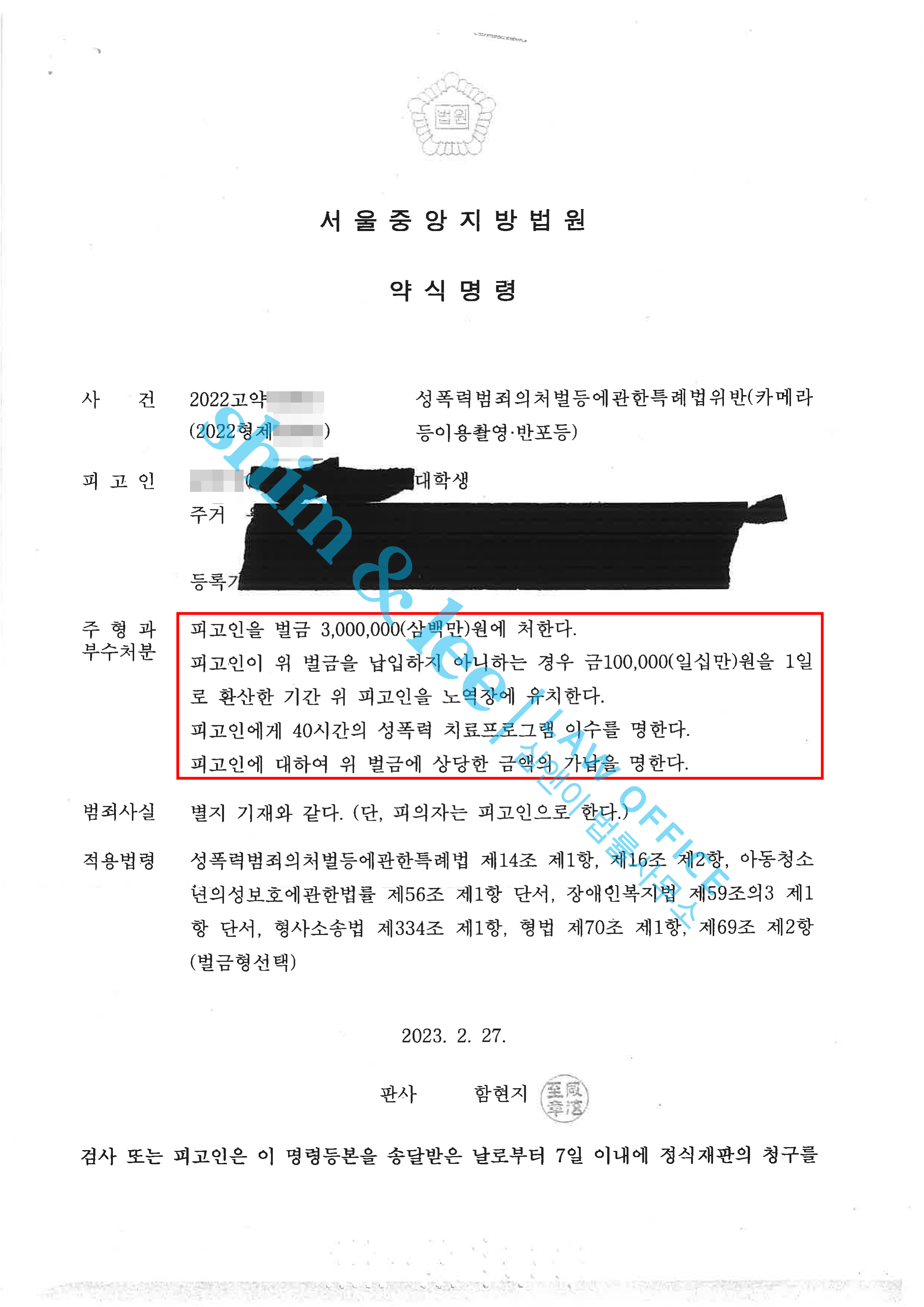 결국 가해자는 벌금 300만 원에 40 시간 성폭력치료프로그램 이수, 변호사비용 등 다양한 손해를 볼 수밖에 없었고, 피해자는 손해 없이 피해보상을 받고 사건을 마무리할 수 있었습니다.