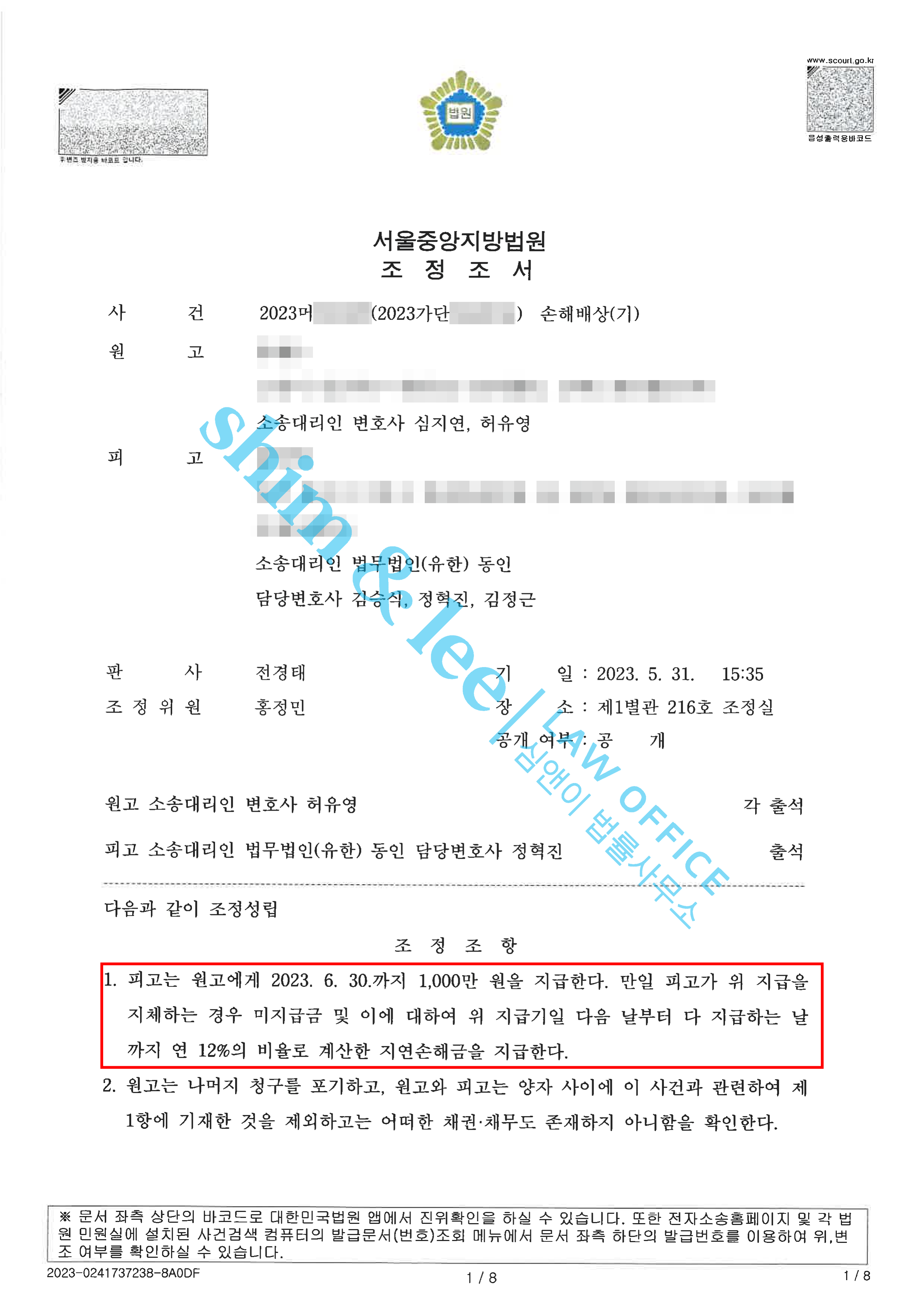 덕분에 민사조정으로 넘어가서도 조정위원님이 피해자의 편에서 가해자를 압박하도록 유도할 수 있었고, 심앤이의 허유영 변호사는 민사조정에서 상당히 높은 금액인 1,500만 원 이상을 요구하면서 강경한 태도로 협상을 진행했습니다.