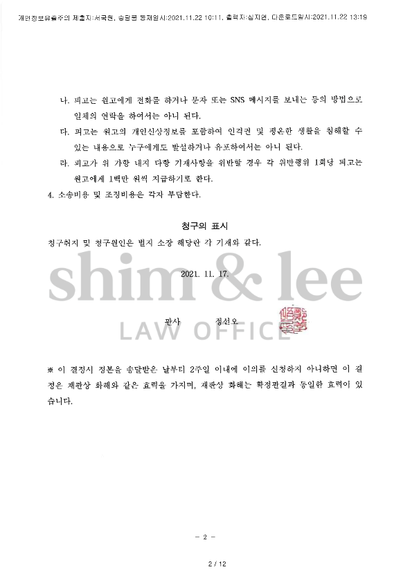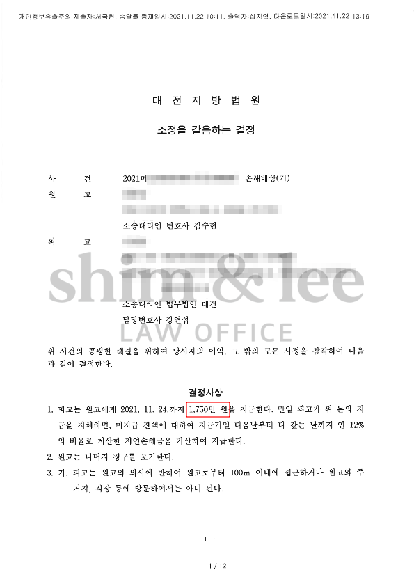 민사조정을 통해 가해자로부터 1,750만 원을 즉시 수령했으며, 가해자의 접근 금지와 연락 금지, 그리고 피해사실 발설 금지와 위반행위 1회당 100만 원의 손해배상까지 약정을 받았습니다.