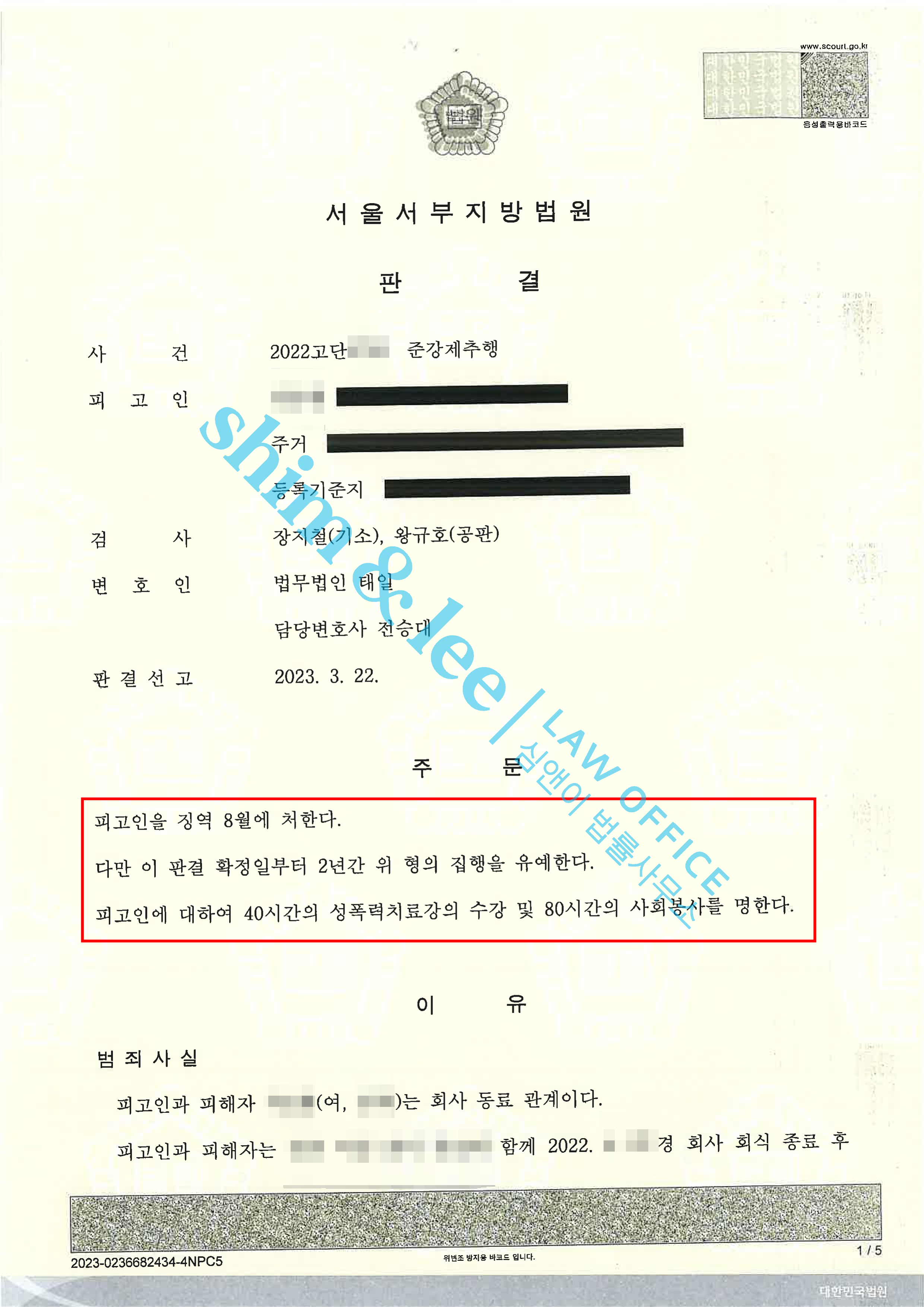 형사고소직장 내 성추행, 항소심에서 법정구속 시킨 사건 2025.12.05징역 8월(법정구속), 성폭력 치료강의 40시간 -