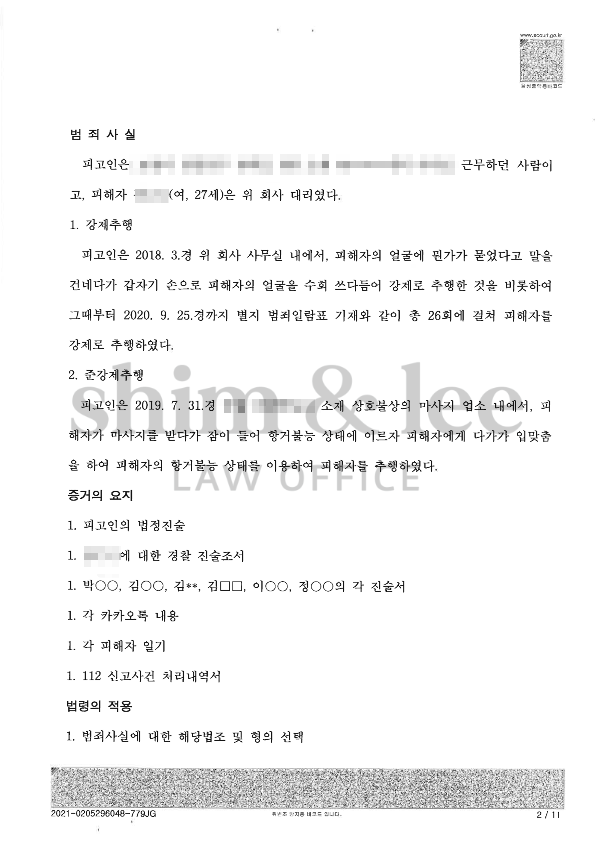 형사고소직장 상사가 자신의 집으로 데려가 추행한 사례 2021.10.27합의금 5,000만 원 -
