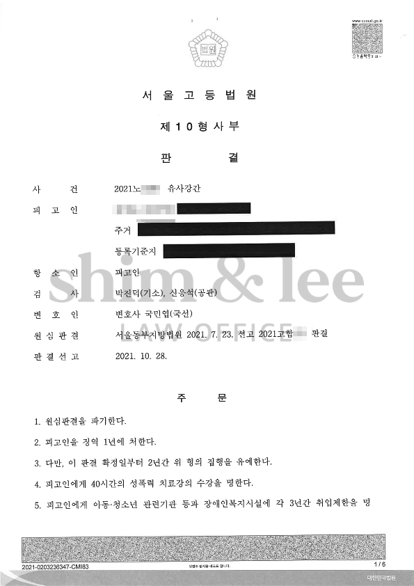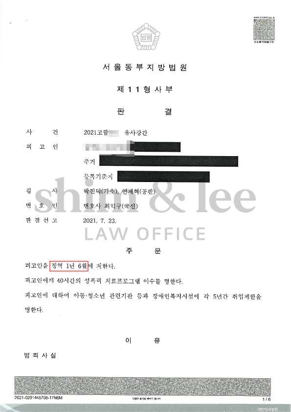 성폭력 치료강의 40시간 / 합의금 1,700만 원 -