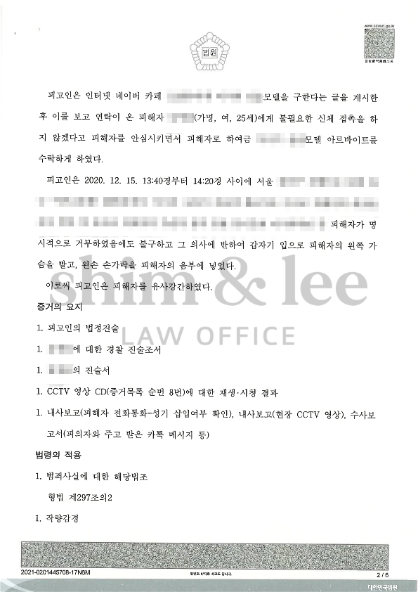 형사고소대학 동기인 가해자와 술을 먹던 중 기습적으로 추행당한 사례 2021.11.23합의금 2,000만 원 -