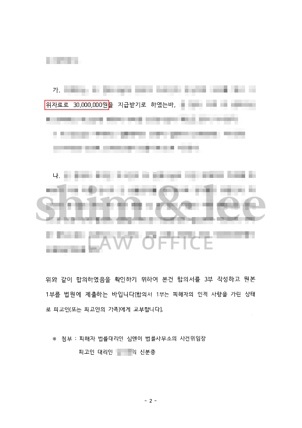 의뢰인 또한 저희 설득에 동의하여 최소 3,000만 원은 되어야 한다고 결정했으며, 해당 금액을 목표로 합의를 진행했습니다. -