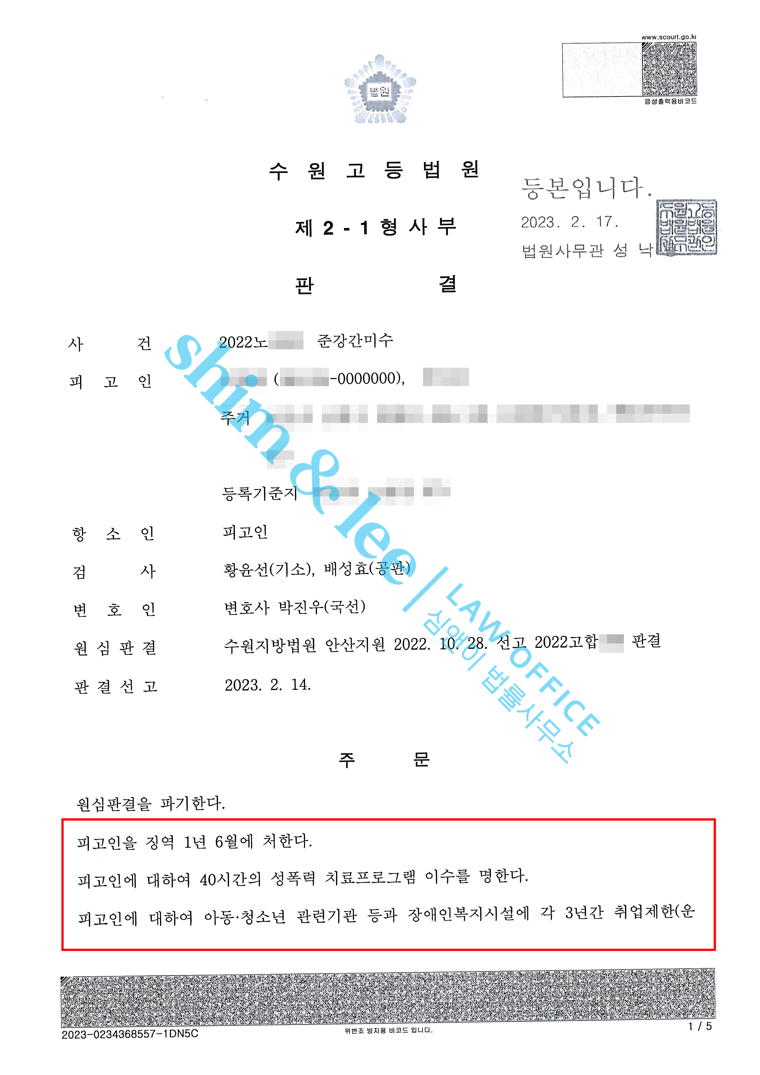 최종적으로 가해자는 1년 6월의 실형에 40시간의 성폭력 치료강의, 3년의 취업제한까지 부가적인 벌로 받아야 했습니다. 피해자는 최상의 결과를 얻었다며 눈물을 흘리며 기뻐하셨습니다.