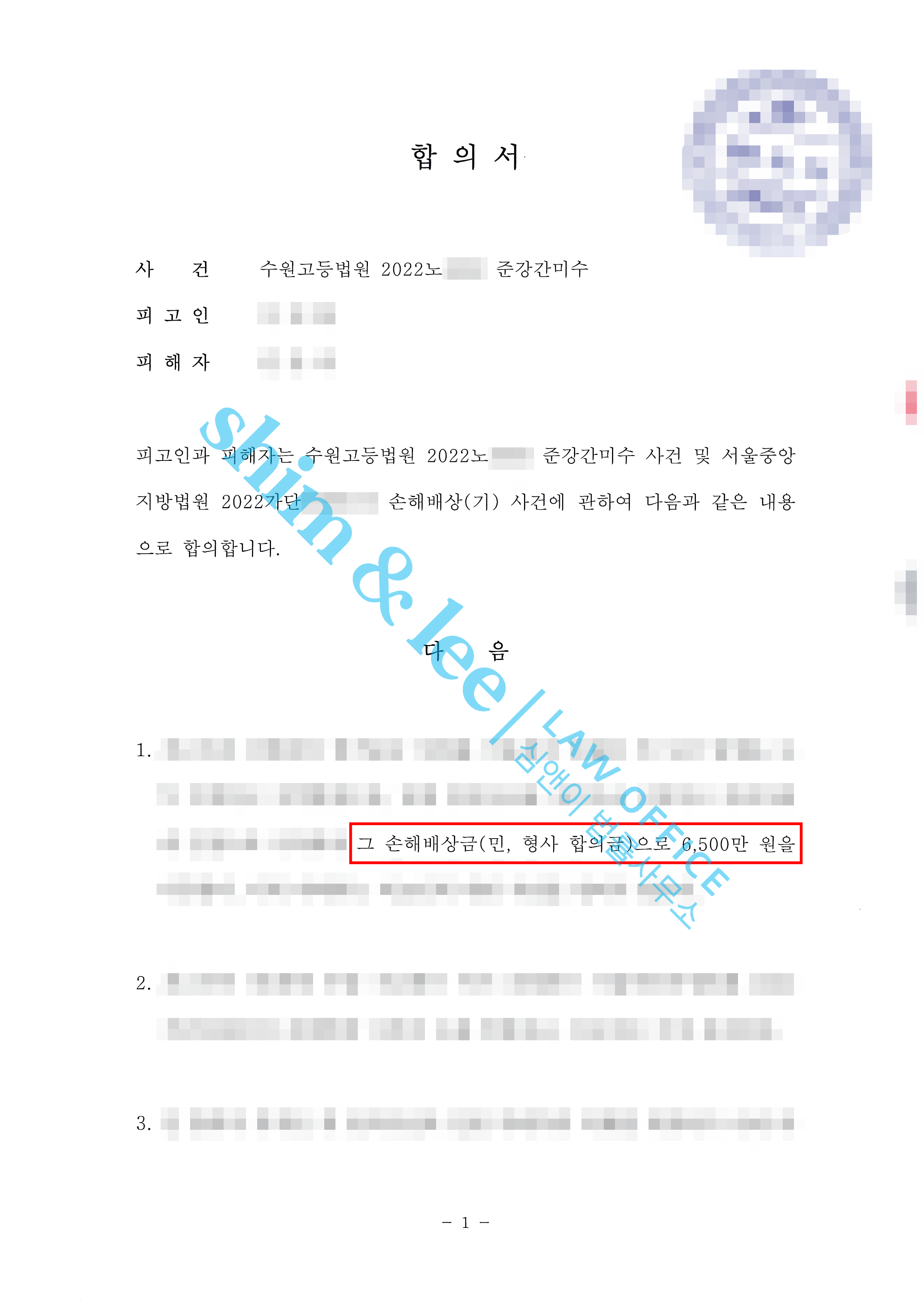 합의대행미팅에서 만나 모텔로 이동했다가 잠든 사이 추행당한 사례 2022.06.24합의금 1,500만 원 -