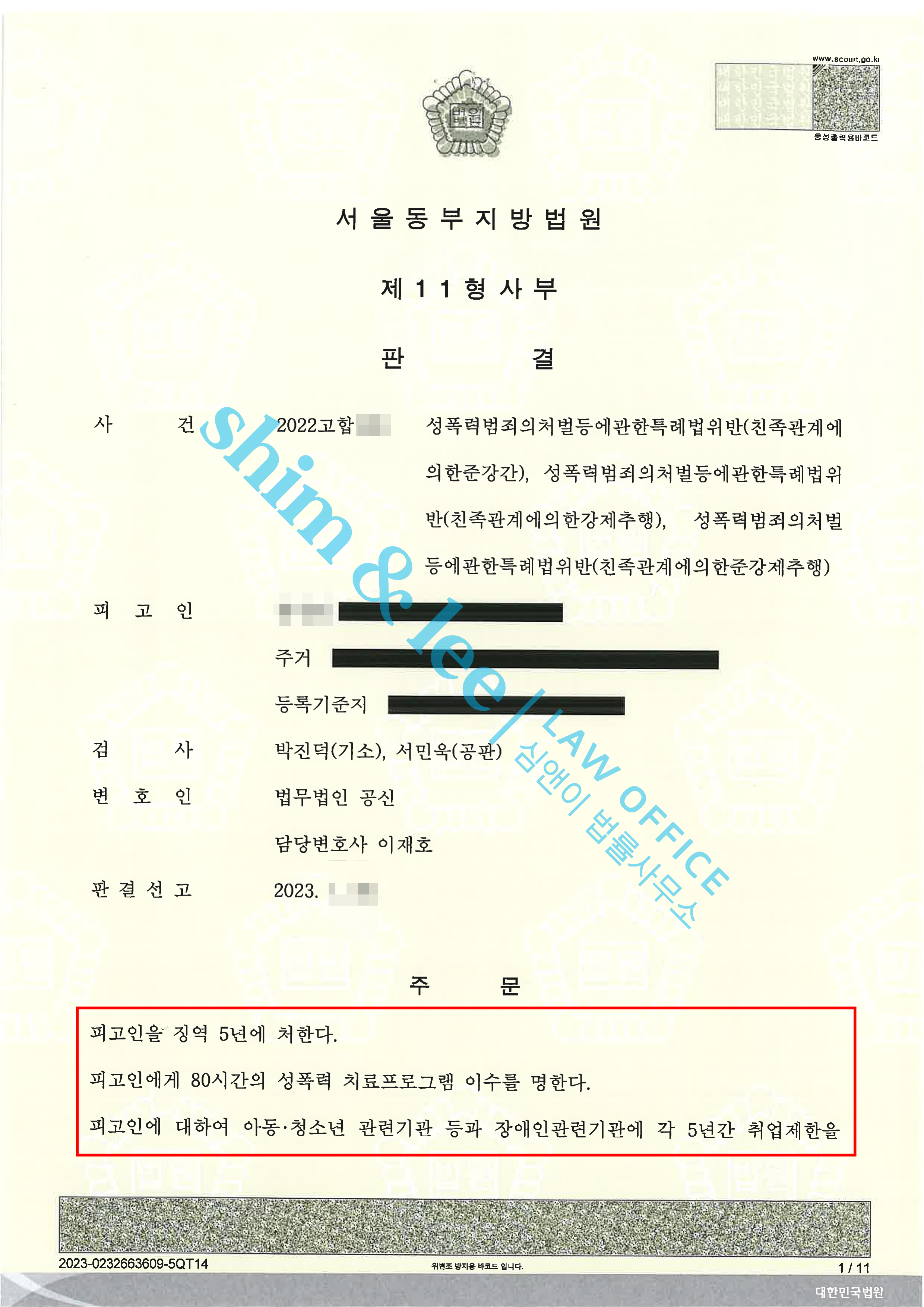 성폭력 치료강의 40시간 / 합의금 1,500만 원 -