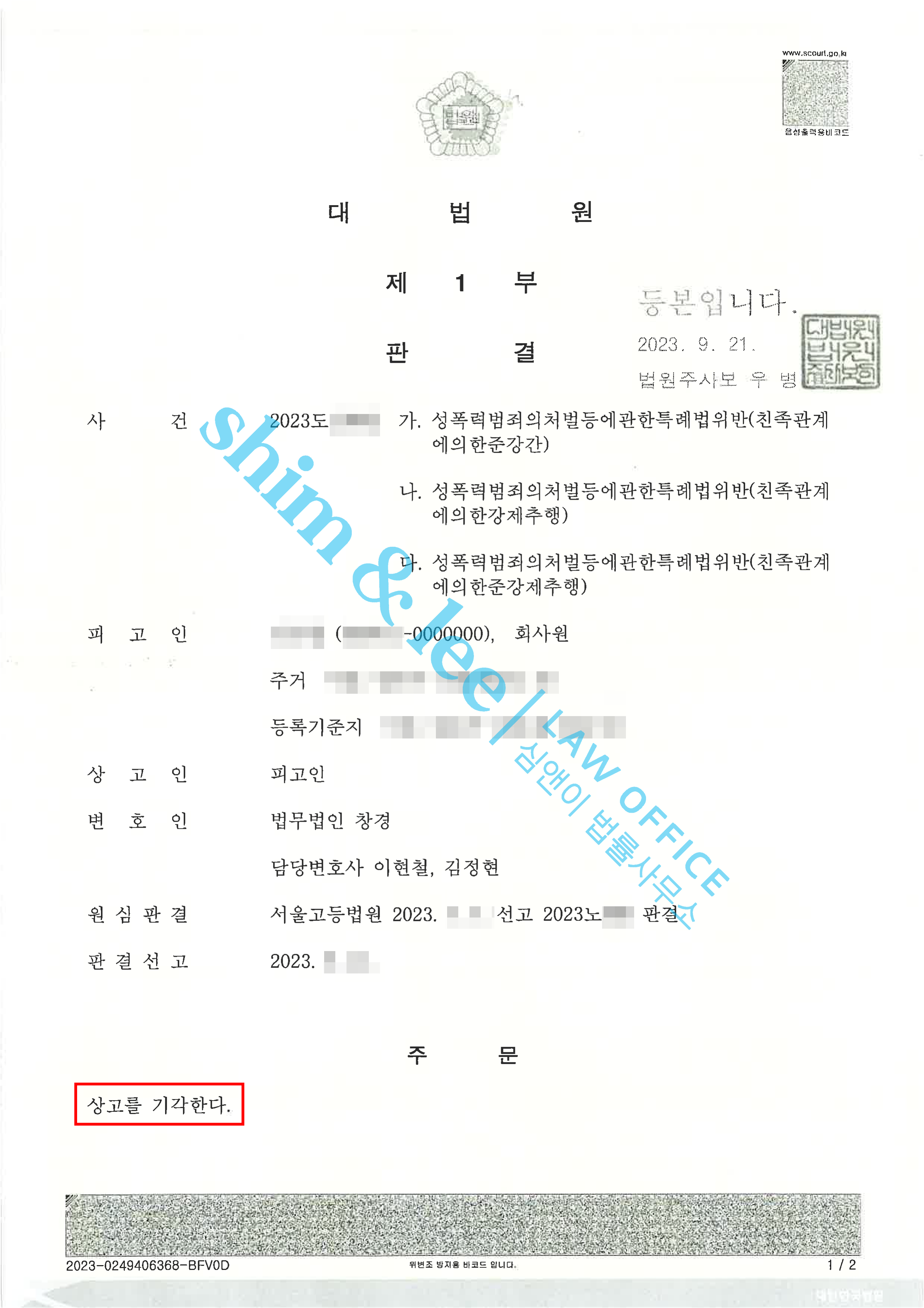 - 합의를 했음에도 가해자의 상고 기각되어 징역 5년, 성폭력 치료강의 80시간, 취업제한 5년의 1심 판결 유지