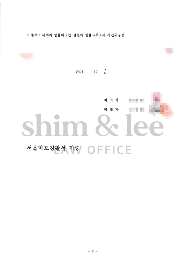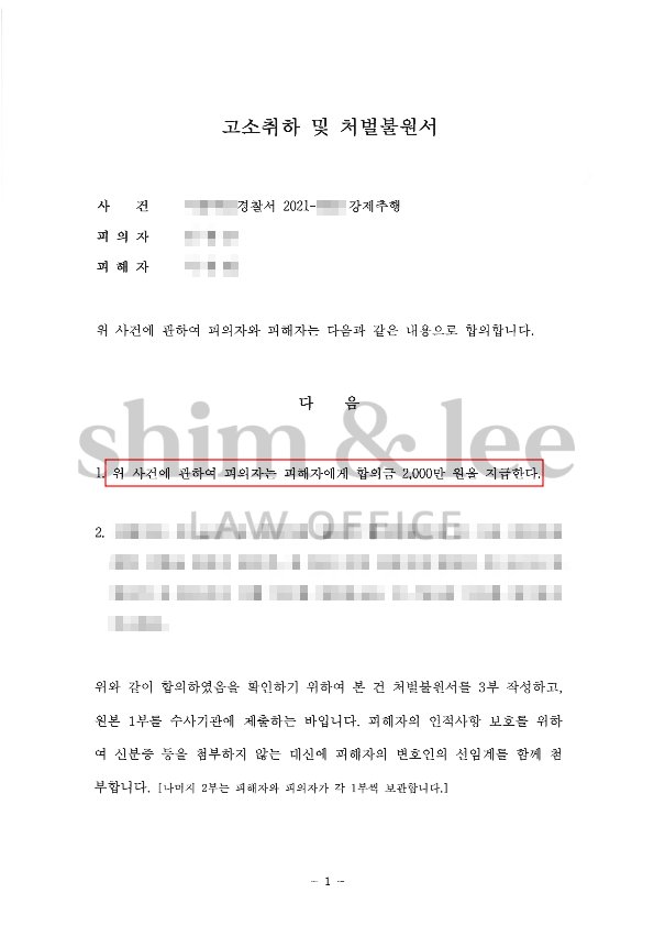 결국 2,000만 원 일시금 지급으로 합의 조건을 결정하여 마무리했으며, 가해자는 수사단계에서의 합의로 기소유예 처분을 받았습니다.