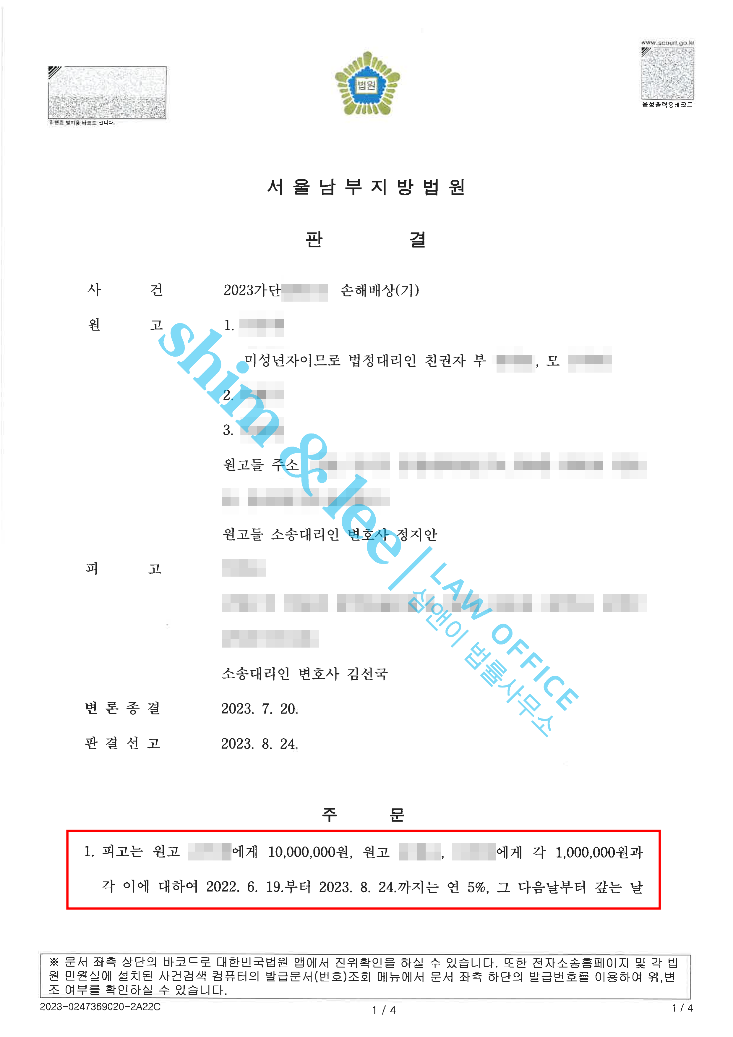 - 심앤이는 청구금액을 상향시키기 위해 피해자 뿐만 아니라 피해자의 부모까지 소송당사자로 등록하여 인용액을 최대한 높이는 전략으로 사건 진행