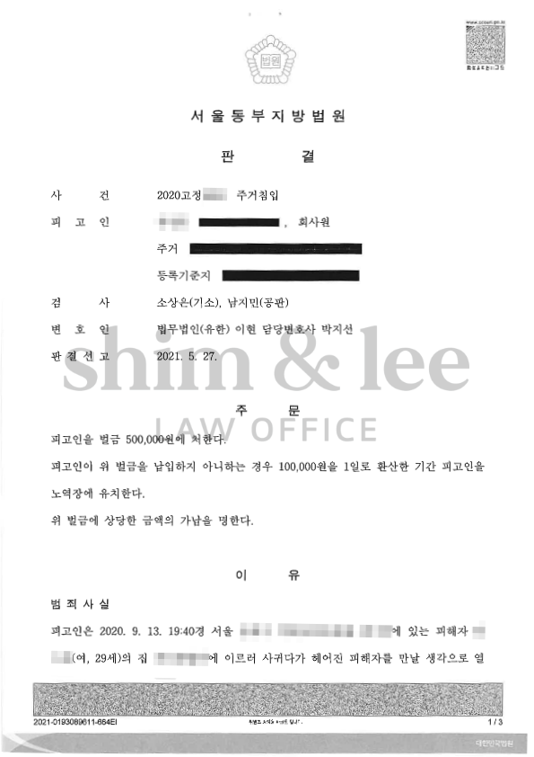결국 의뢰인이 경찰에 신고하여 가해자는 출동한 경찰에 의해 연행되었고, 의뢰인은 즉각 이사를 해야 했습니다.