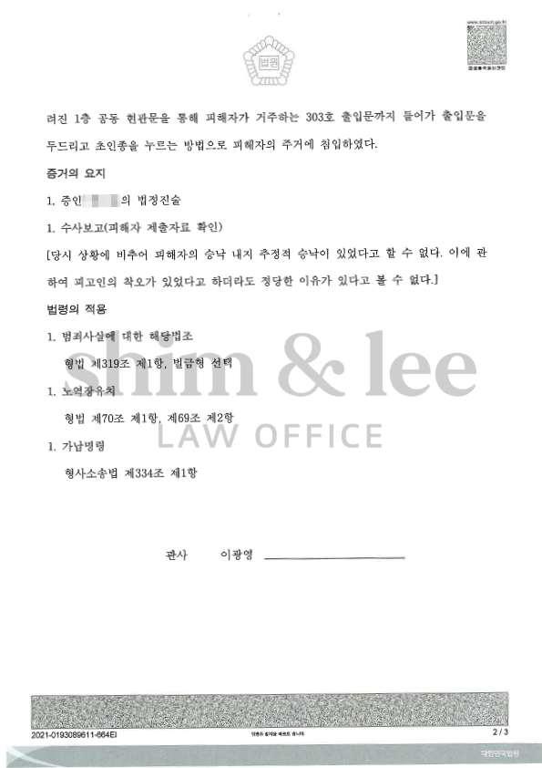 특히 수사기관에서 가벼운 범죄로 보고 기소유예 처분을 내리지 않도록 의뢰인이 겪고 있는 정신적 트라우마와 공포를 자세하게 어필했습니다. -