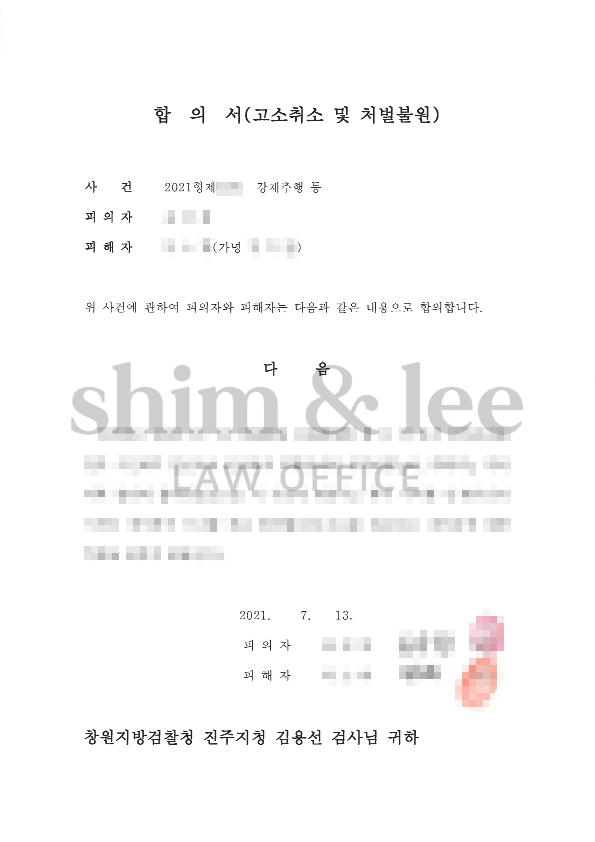 형사고소직장 상사가 산책 중 갑자기 성관계를 요구하며 강제로 추행한 사례 2022.01.03합의금 2,000만 원 / 기소유예 -