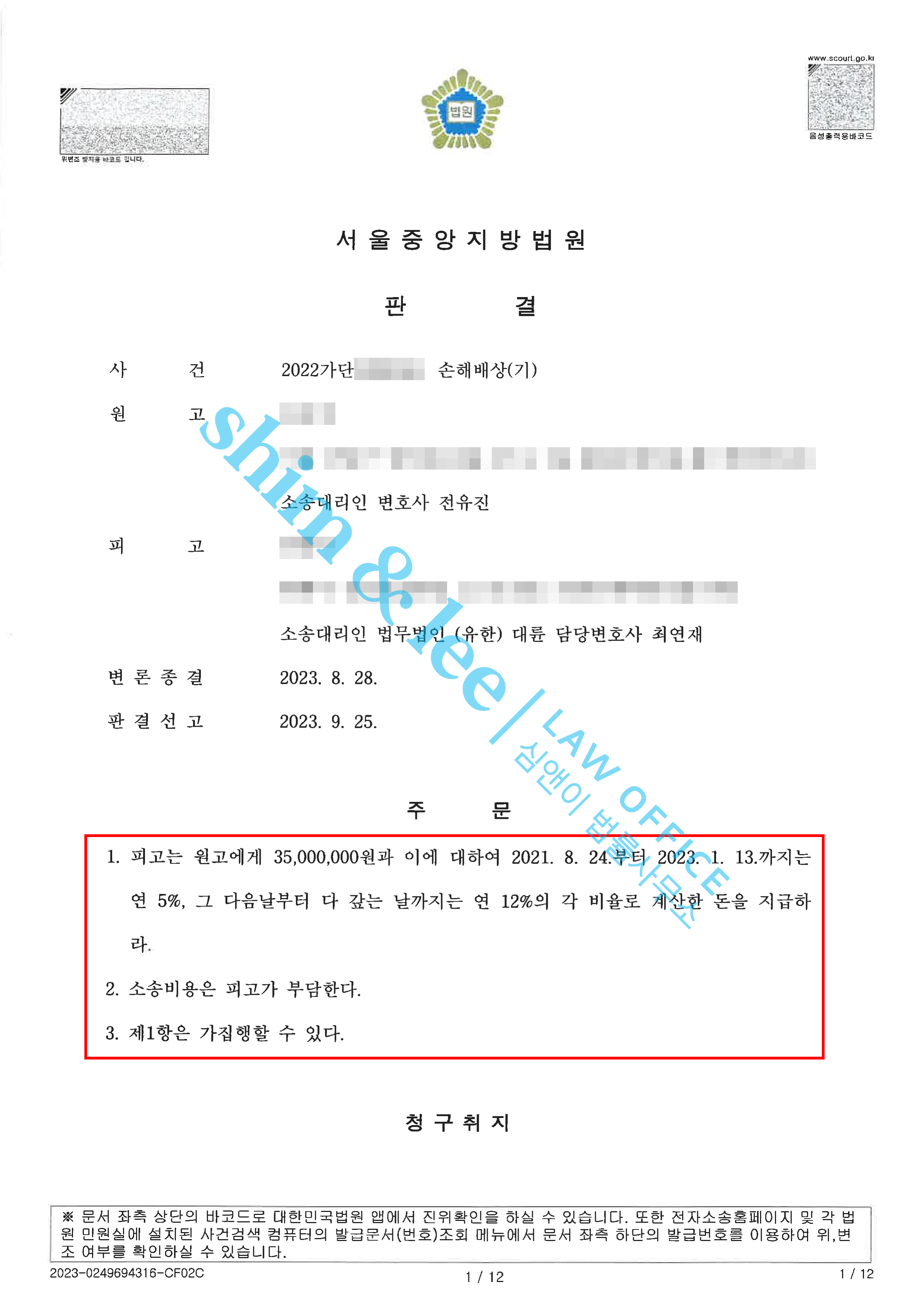 - 원고 전부승소로 대승을 거둬 3,500만 원 전액 인용