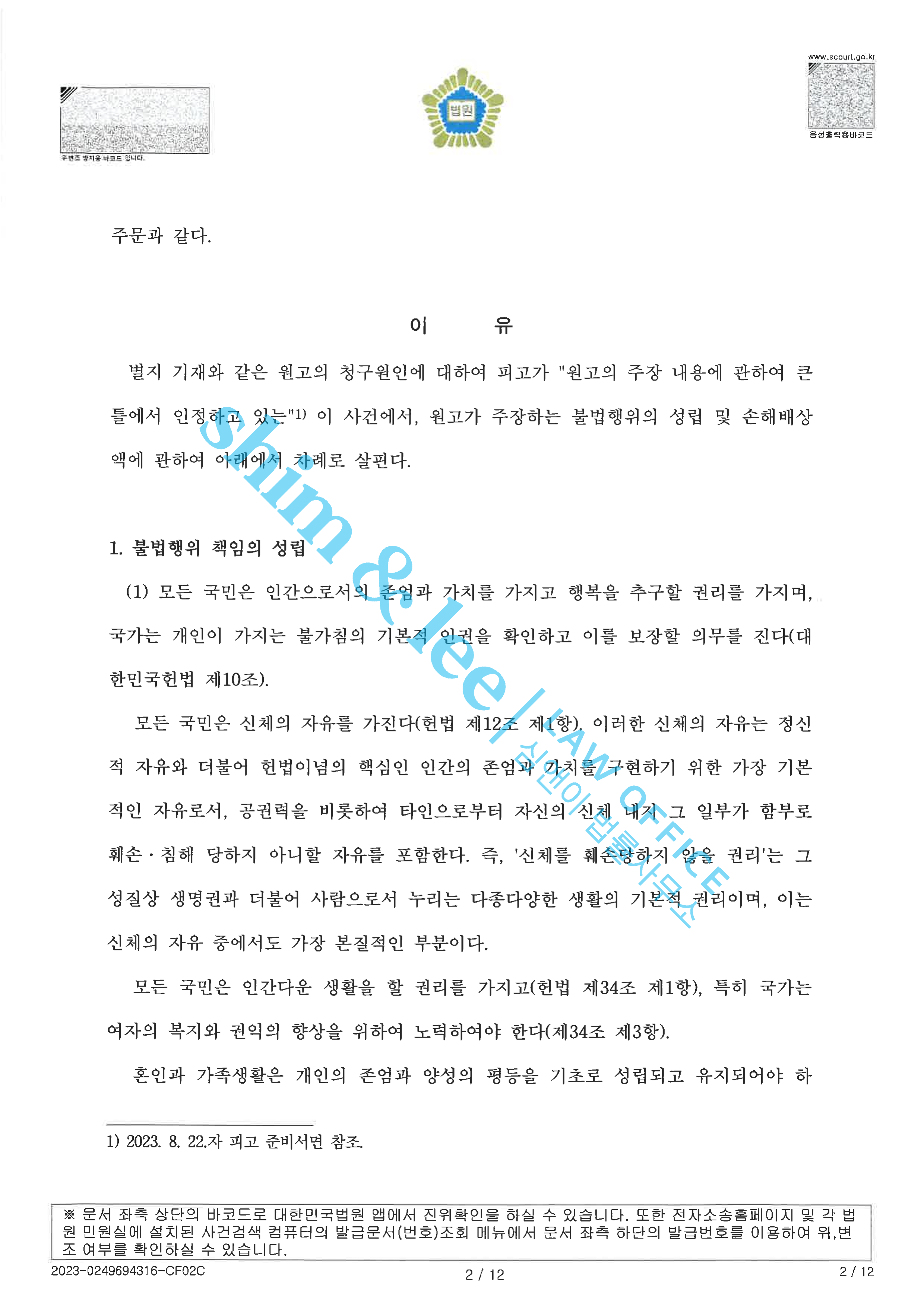- 높은 위자료를 인정받기 어려운 사건이었지만, 심앤이는 가해자를 압박하는 차원에서나 변론 차원에서나 소액 보다는 단독 사건으로 진행하는 것이 낫다고 판단해 3,500만 원의 소가 청구