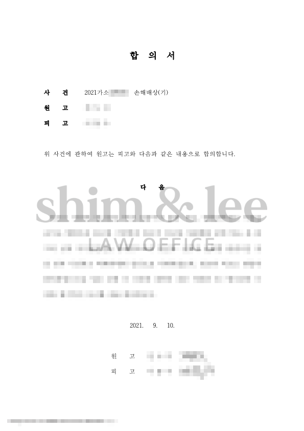 처음부터 증거를 상세하게 확보하고 아무런 예고 없이 들어간 소송이었기 때문에 가해자는 많이 놀란 듯이 보였고, 소장을 송달받자마자 의뢰인에게 연락하여 합의를 요청해왔습니다. -